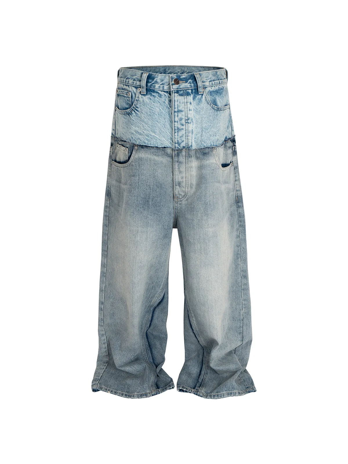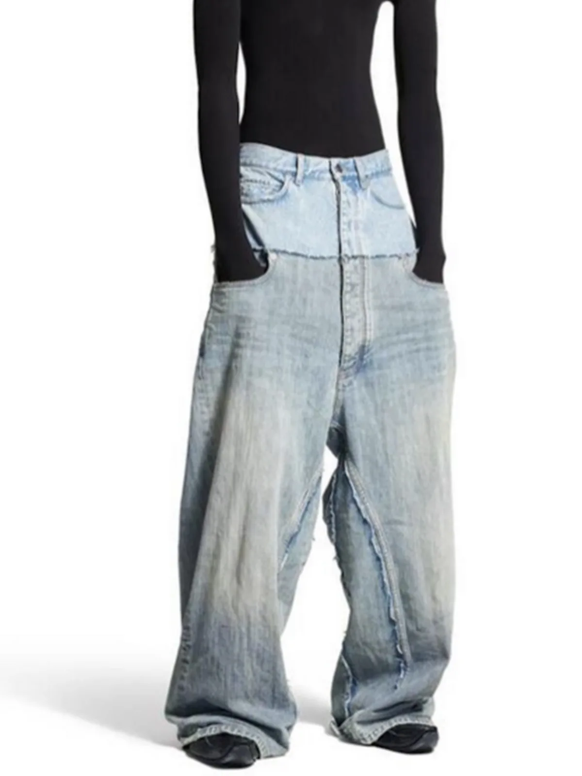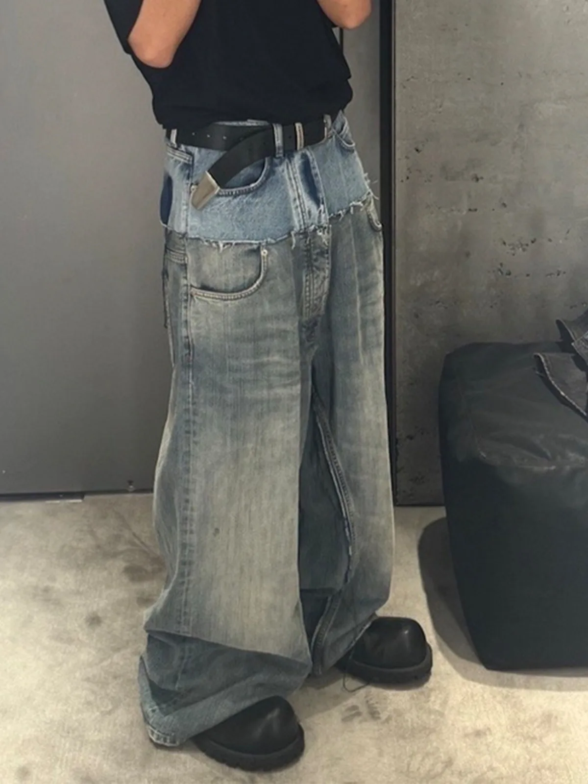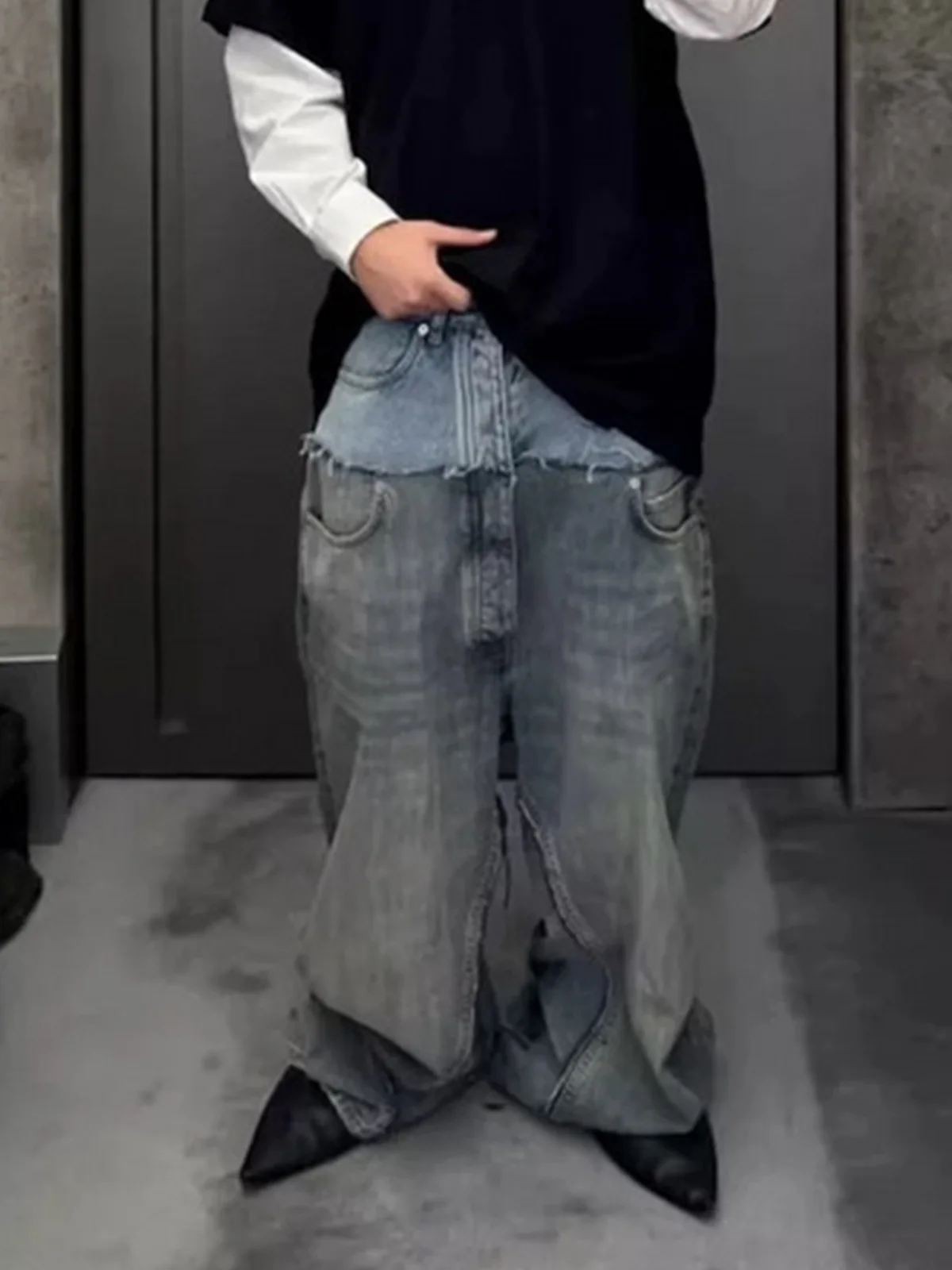 Jean déchiré unisexe à taille haute et jambes larges avec motif moustaches de chat pour hommes et femmes, en denim à deux couches et avec empiècements