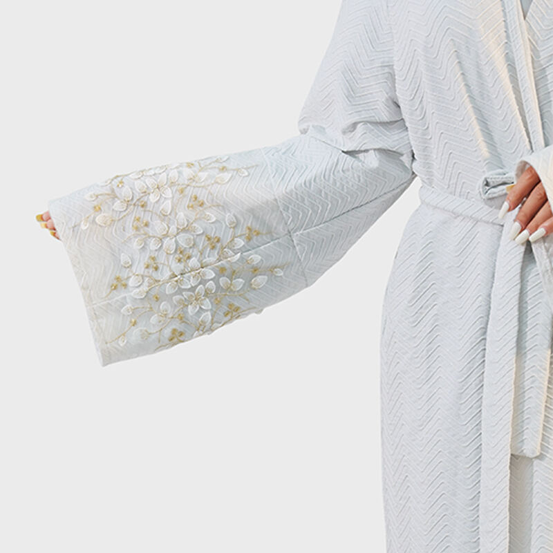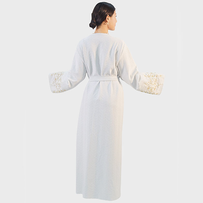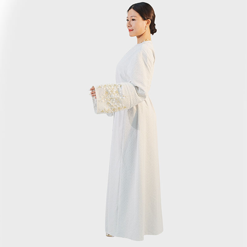패스트패션 중심의 세상에서 에테르 화이트 오픈 아바야는 결코 유행을 타지 않는 클래식하고 우아한 의상으로, 손수 제작된 자수와 잘록하게 다듬어진 허리 라인, 미니멀한 디자인으로 어떤 옷차림도 한층 우아하고 고급스럽게 만들어 줍니다.