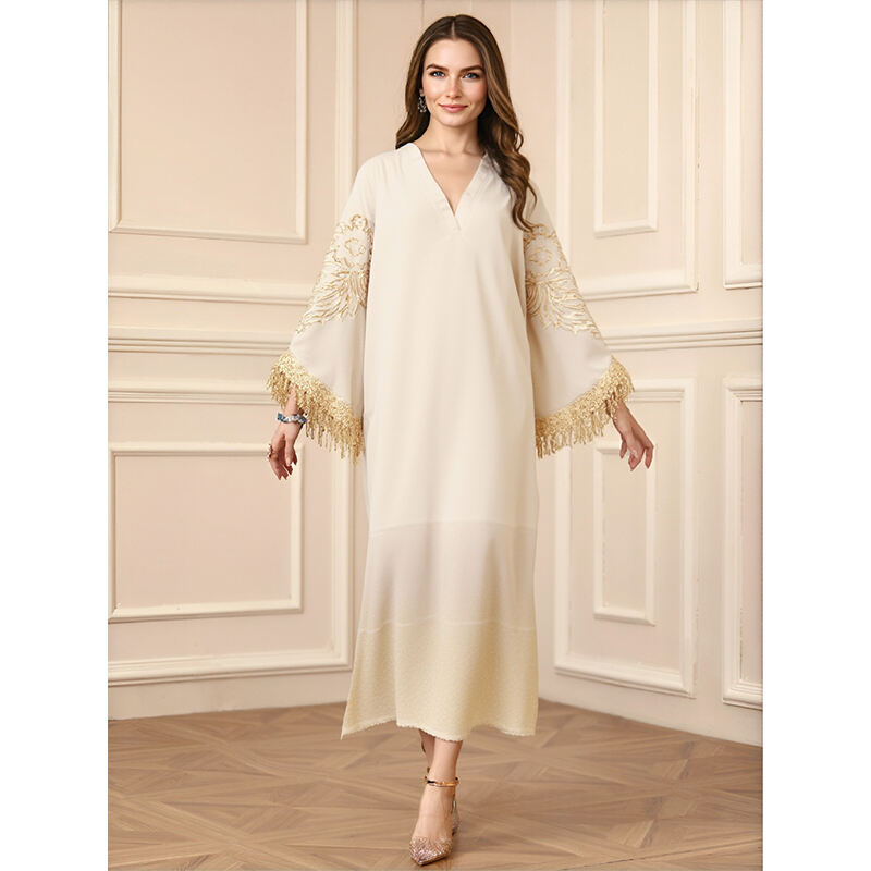 Tilpassing Elegante Arabisk Kjole Abaya Muslimske Kvinner V-hals Brodert Quaste Kåpe Midtøsten Lang Ramadan Kjole