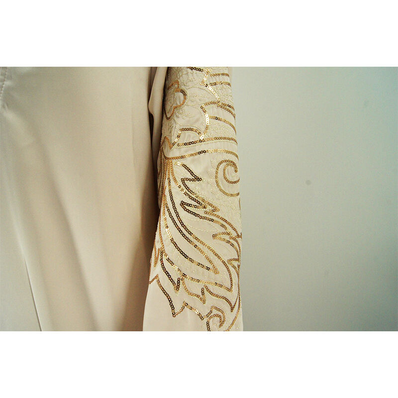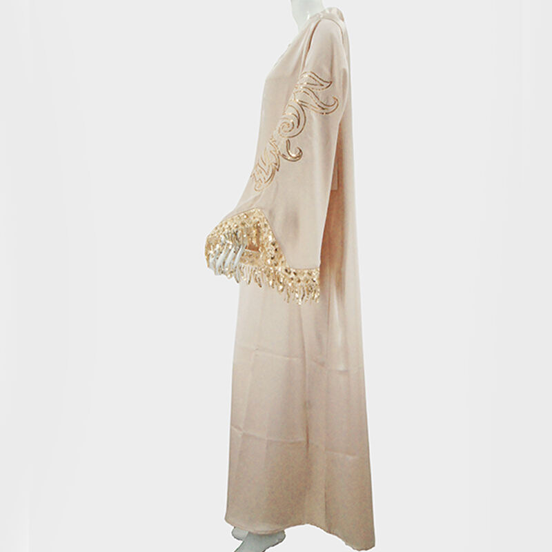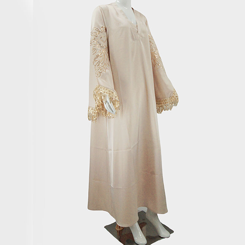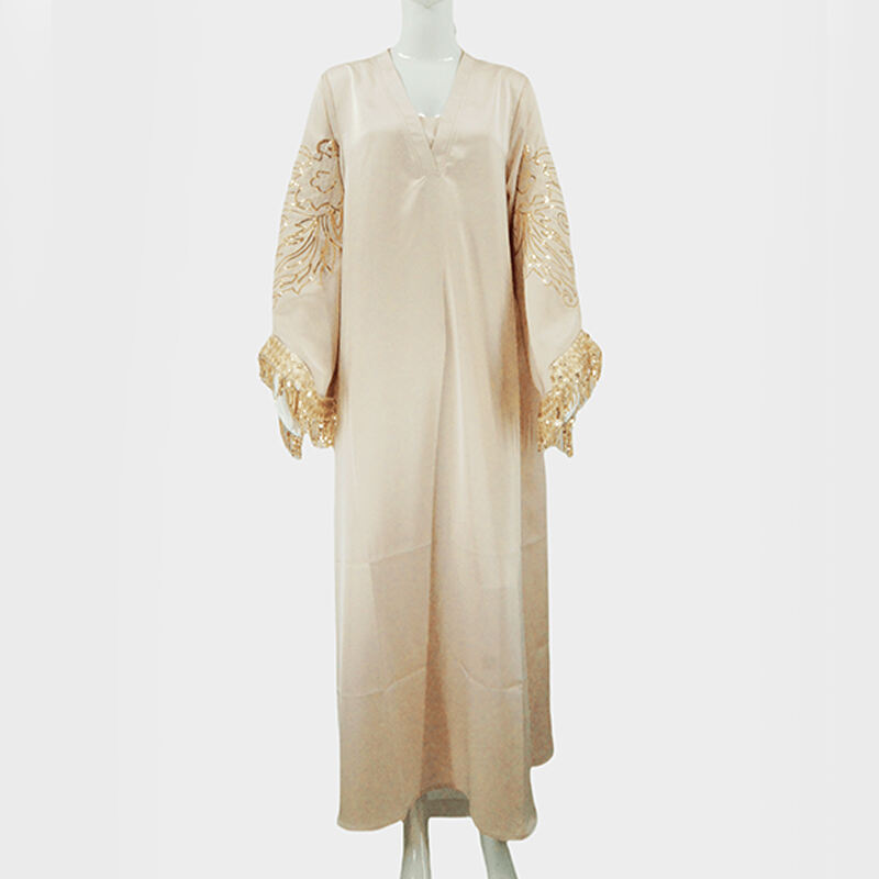 Laget med omsorg og oppmerksomhet på detaljer, har denne kleddet i middelhavsstil komplisert broderi og fine franser som legger til en berøring av glamour i den tradisjonelle abaya-stilen. Det flytende silhuetten og lange lengden på kjolen gjør den ideell til Ramadan eller enhver annen formell begivenhet, og gir både stil og anstendighet for den moderne muslimske kvinnen.