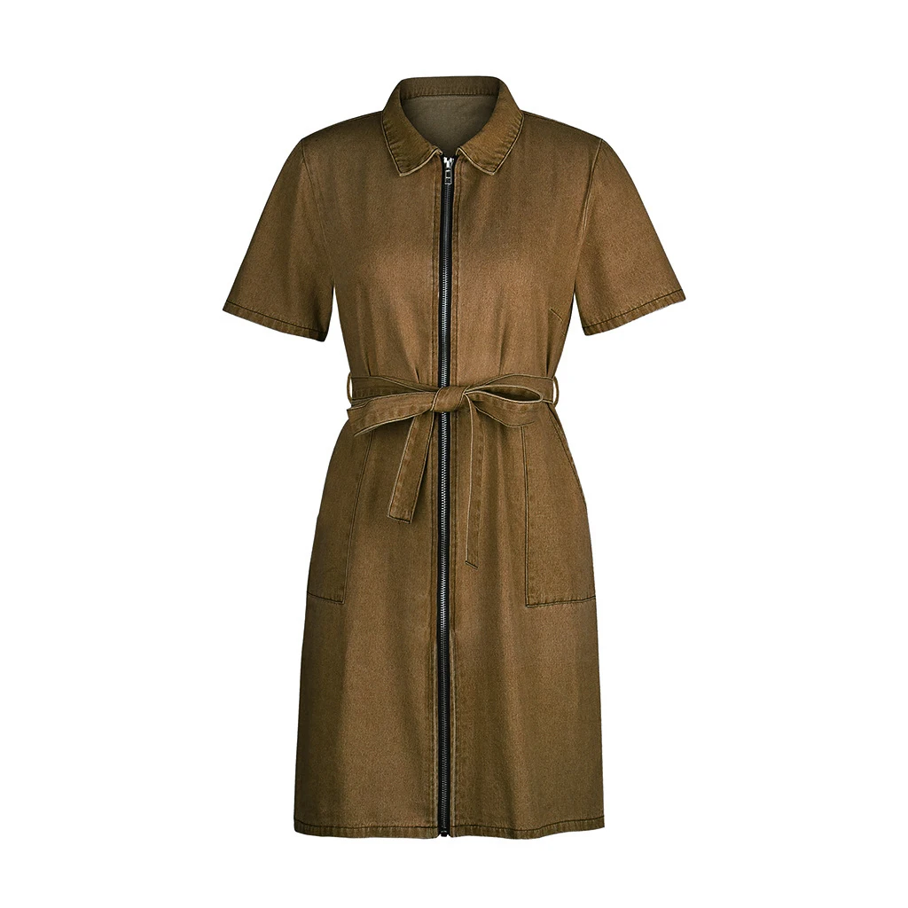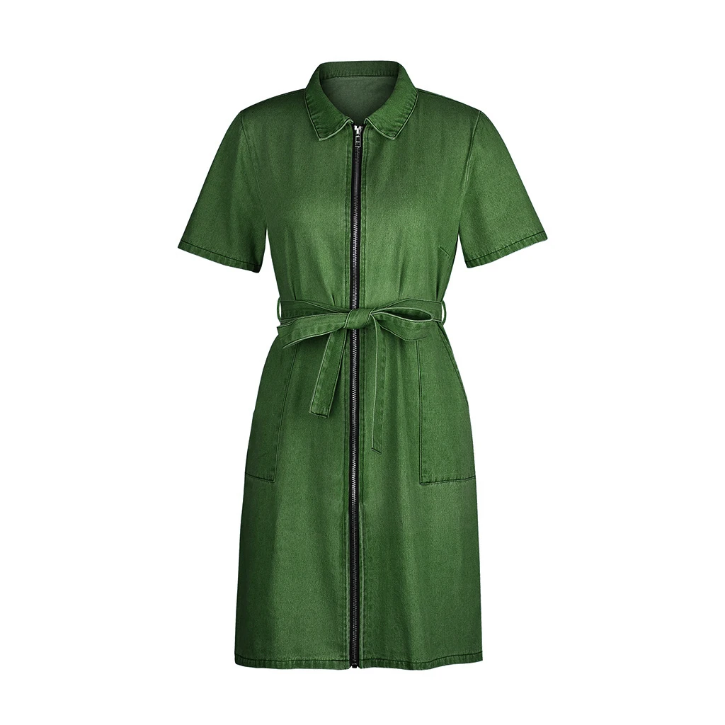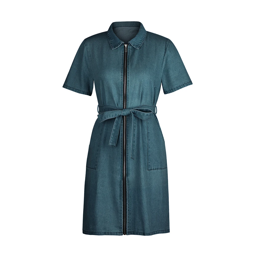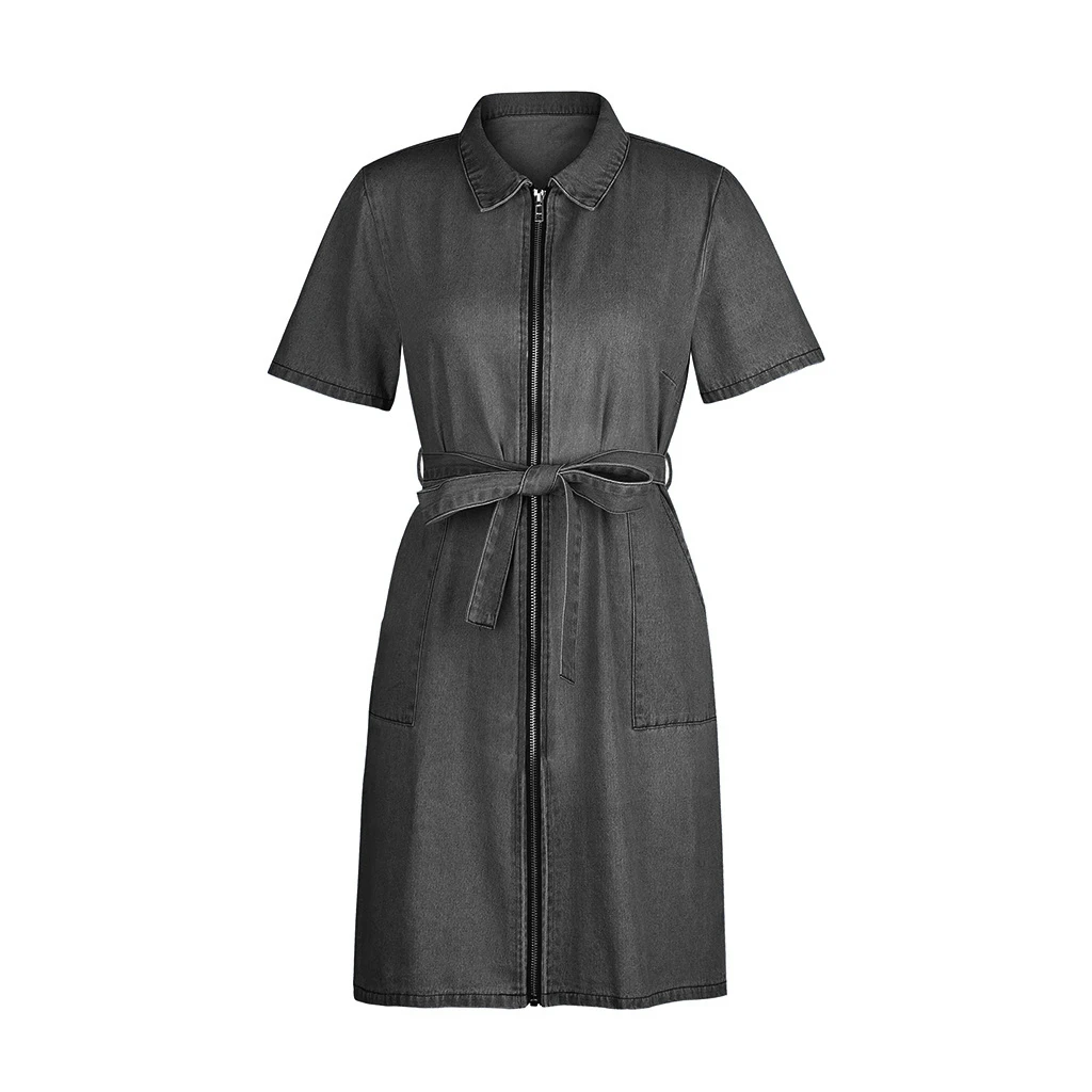 Sommerkjole i jeansstoff med casual livrem, lommer, korte ermer og glidelås - kvinne kjole til fest eller som swingkjole med korte ermer