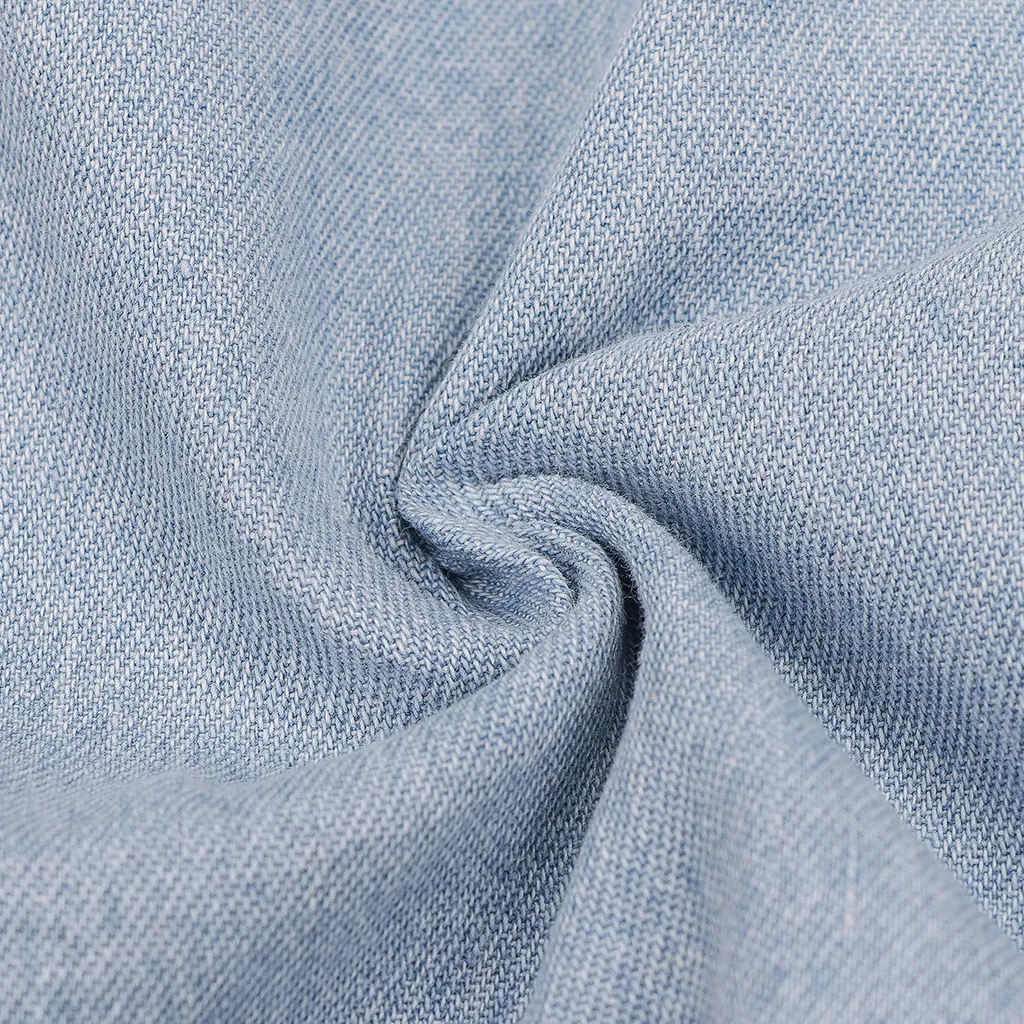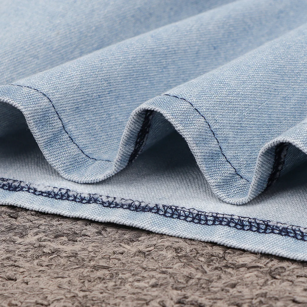 Egenskaper ved jeansstoff : 1. Sterk og holdbar 2. Klassisk stil 3. Høy komfort 4. God mykhet 5. Pustende og absorberende 6. Miljøvennlig 7. Høy fargefasthet