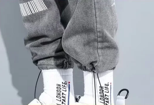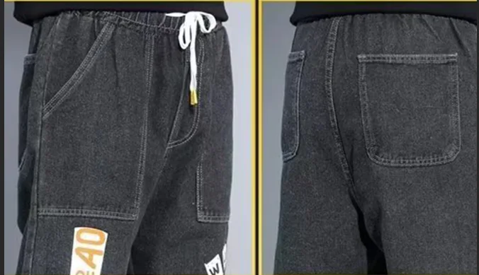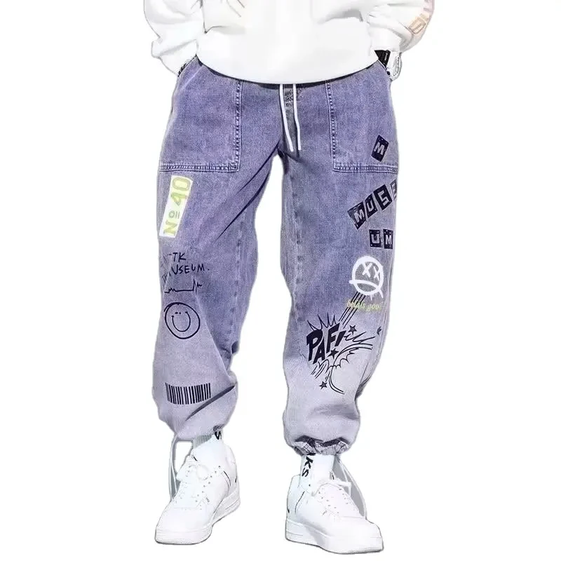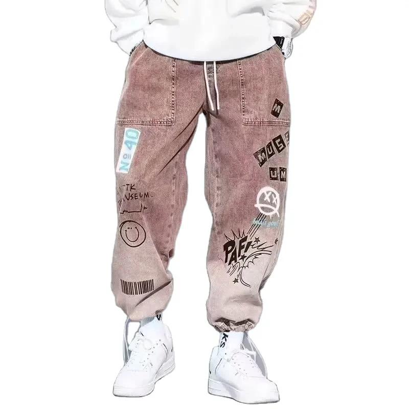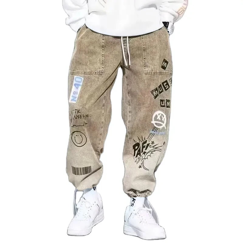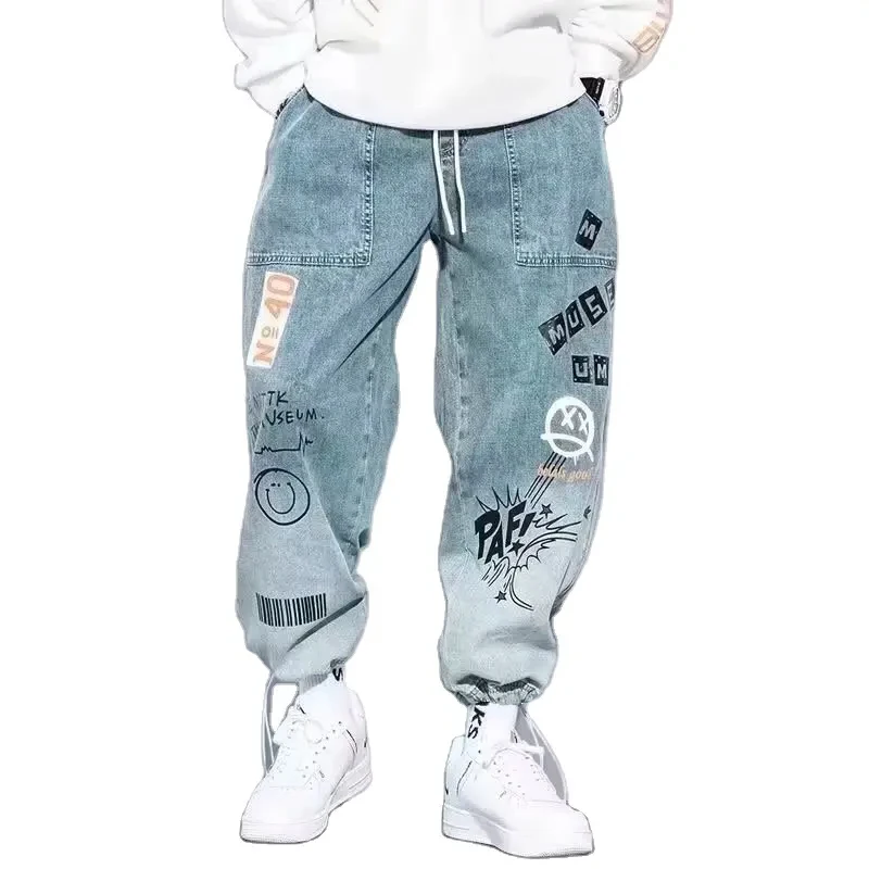 New Autumn 2024 Men'S Trendy Brand Buckle Jeans Denim Loose Casual Graffiti Men Drawstring Elastic Waist Harem Pants
