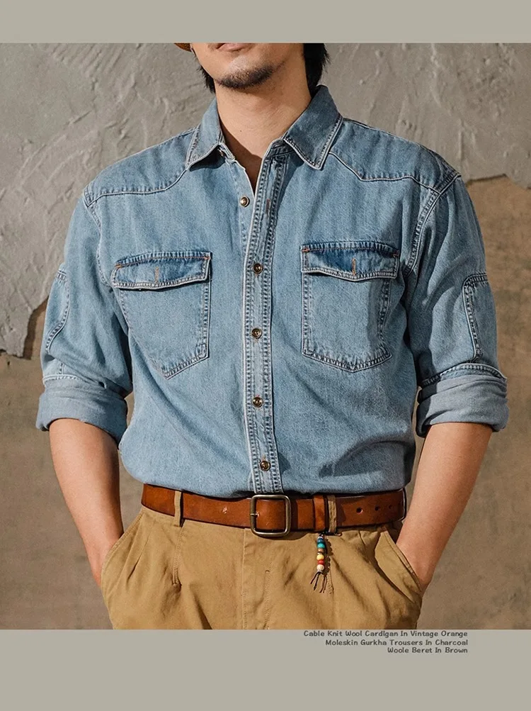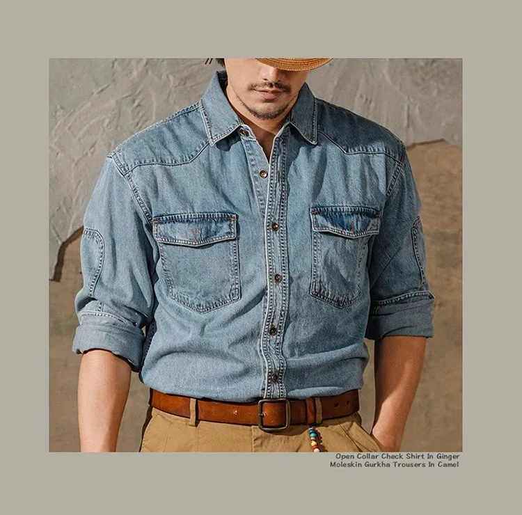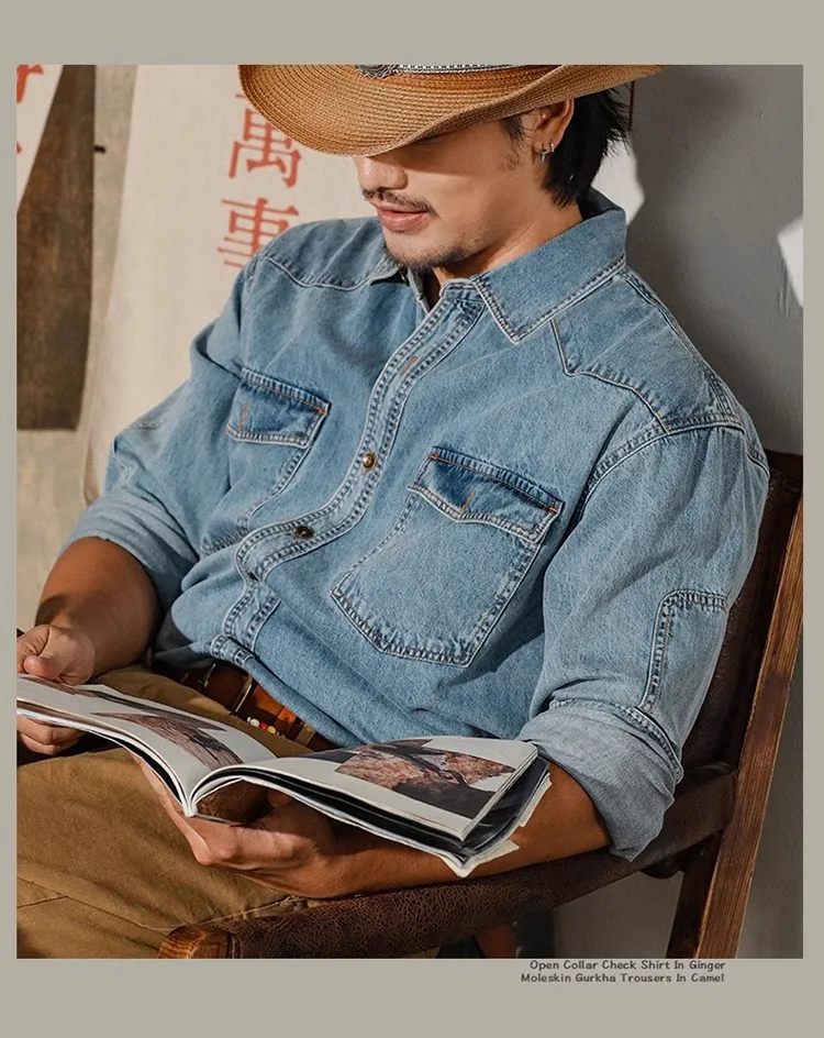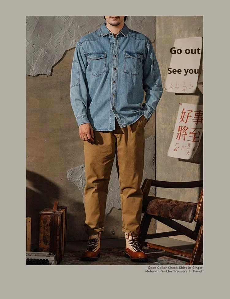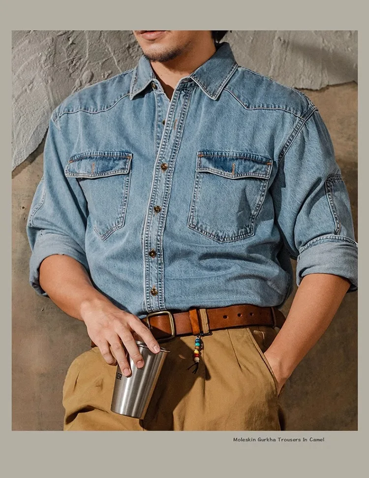 American Retro Western Cowboy Shirt Men Amekaji Long Sleeve Casual Denim Workwear Washed Tough Guy Jacket