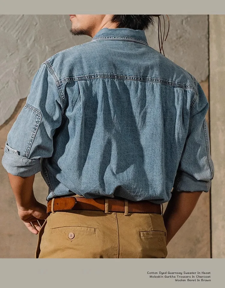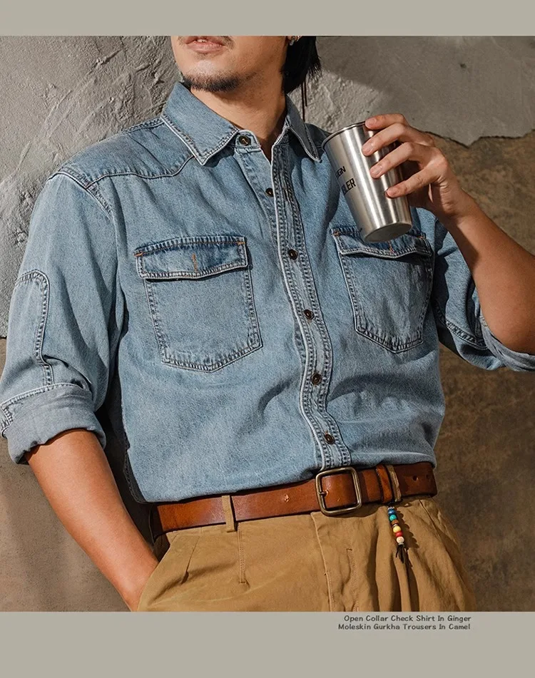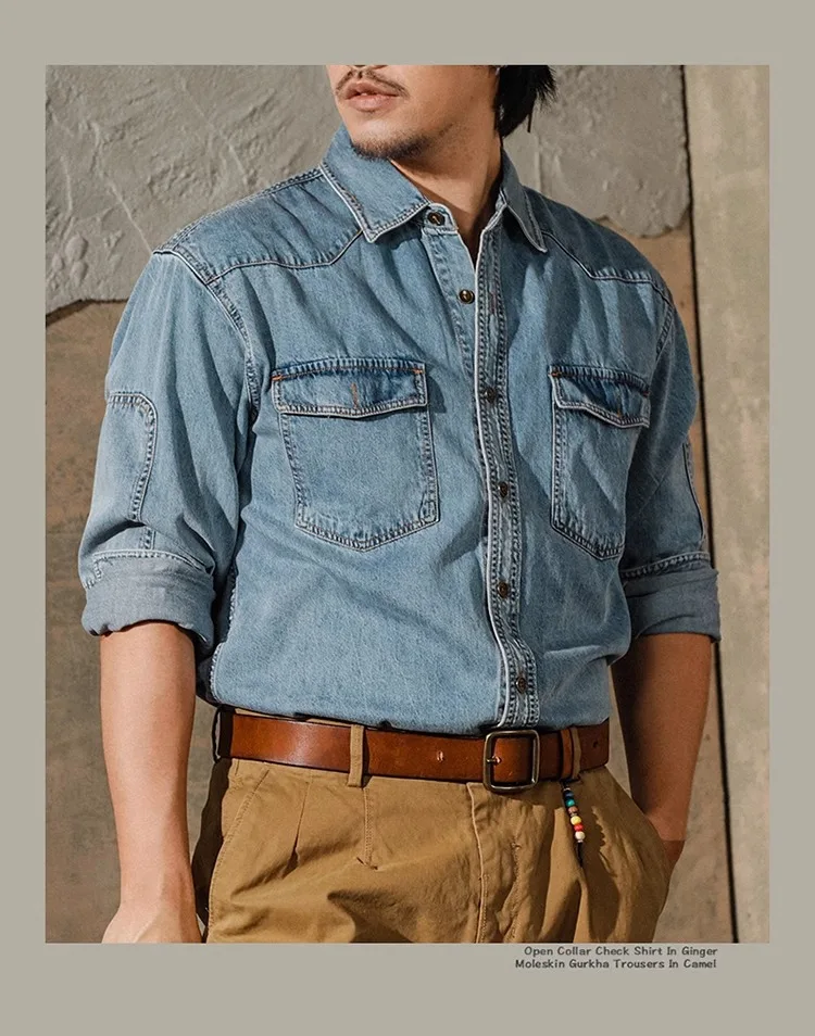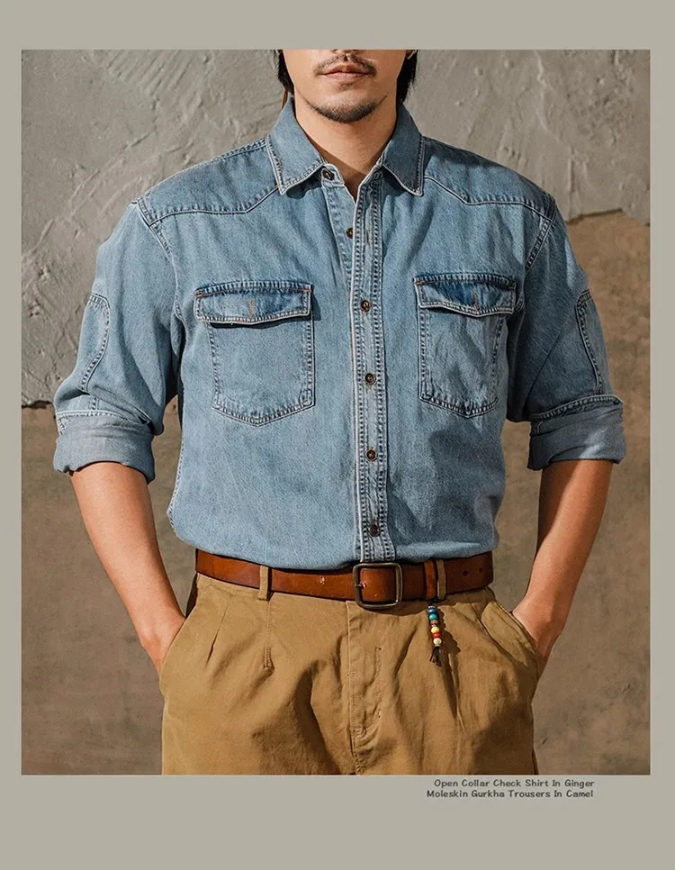 American Retro Western Cowboy Shirt Men Amekaji Long Sleeve Casual Denim Workwear Washed Tough Guy Jacket