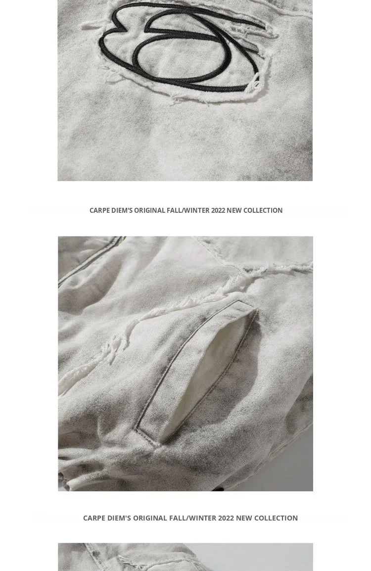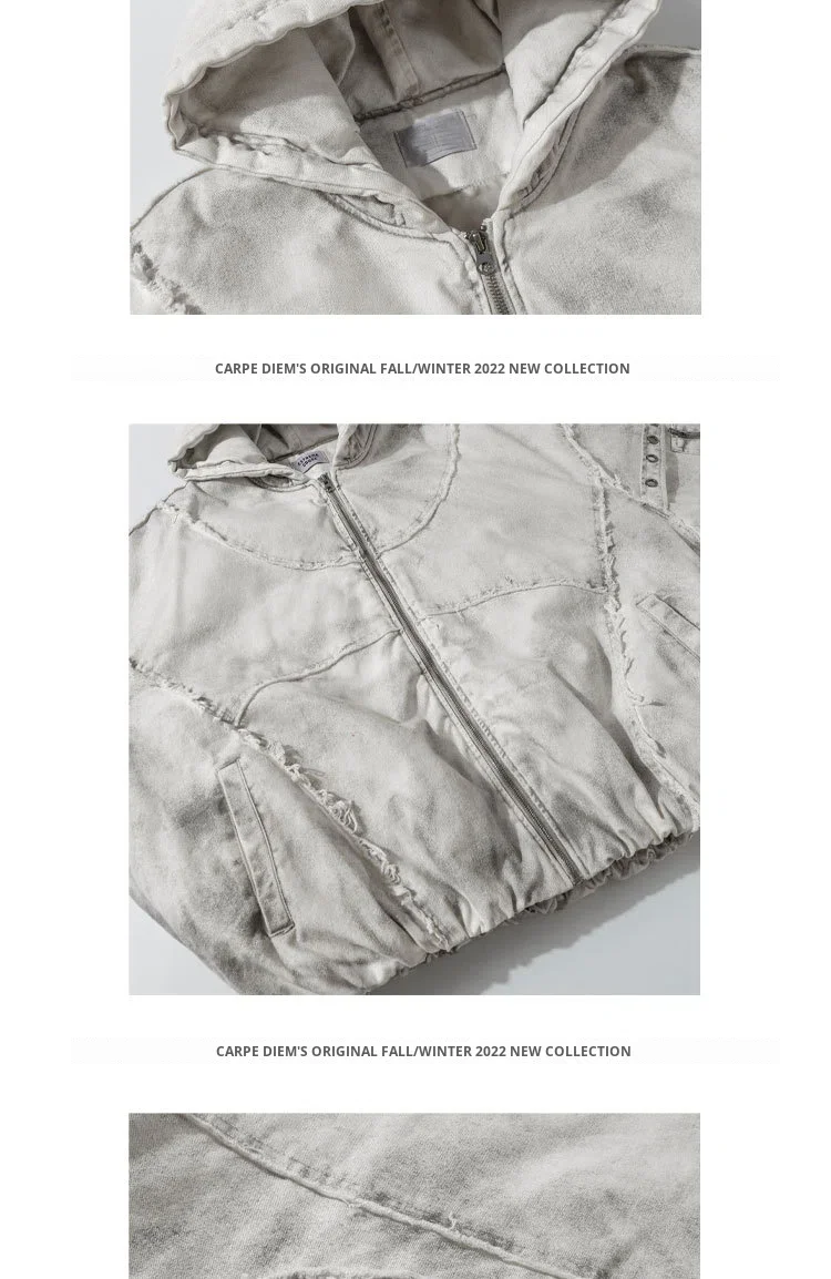 American Style Retro Distressed Hooded Patch Decoration Zipper Quilted Frayed Cotton-padded Coat Men Women Winter Loose Warm