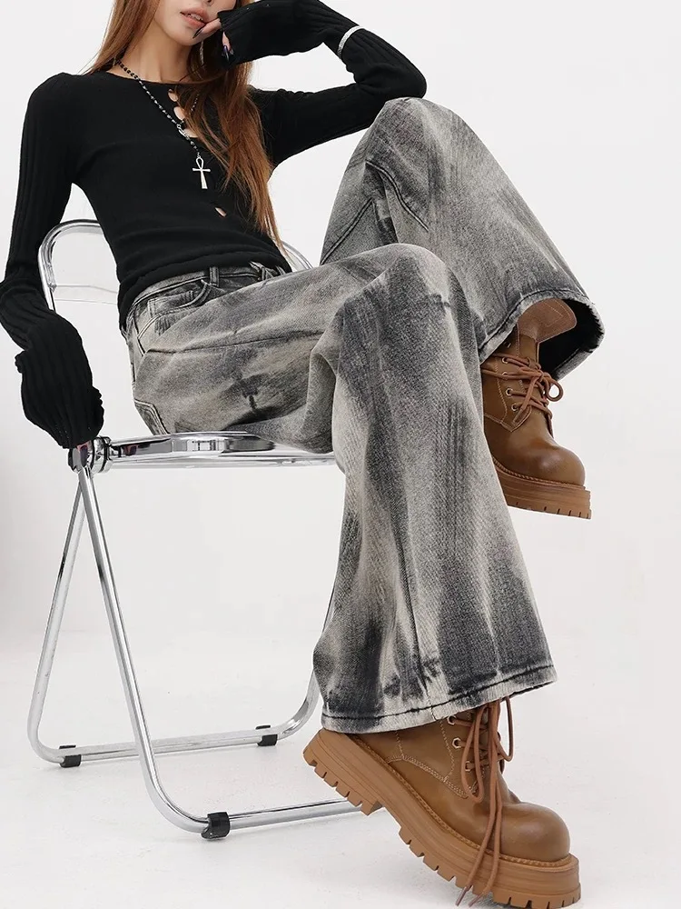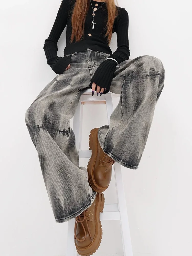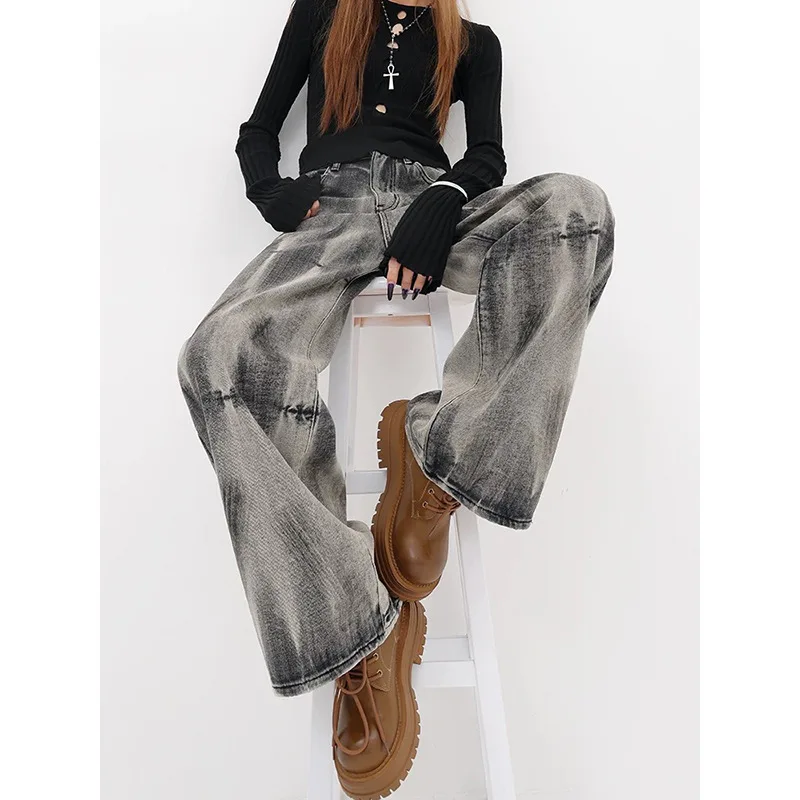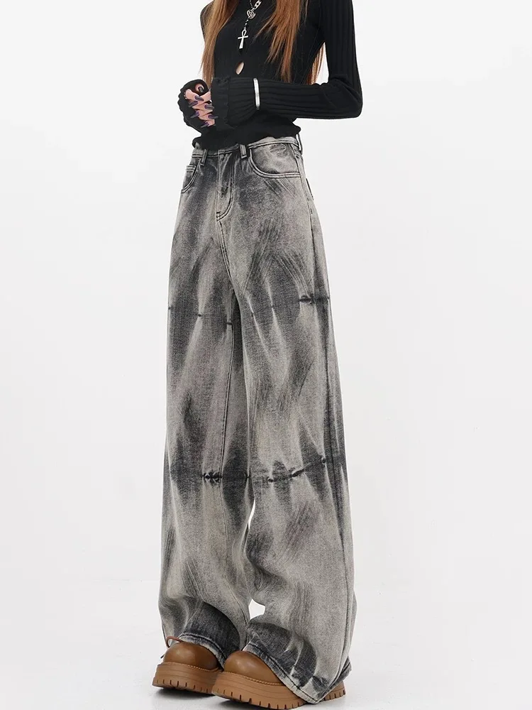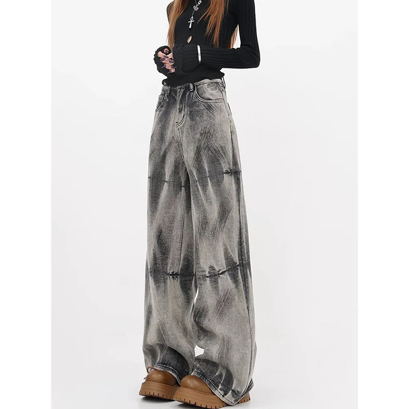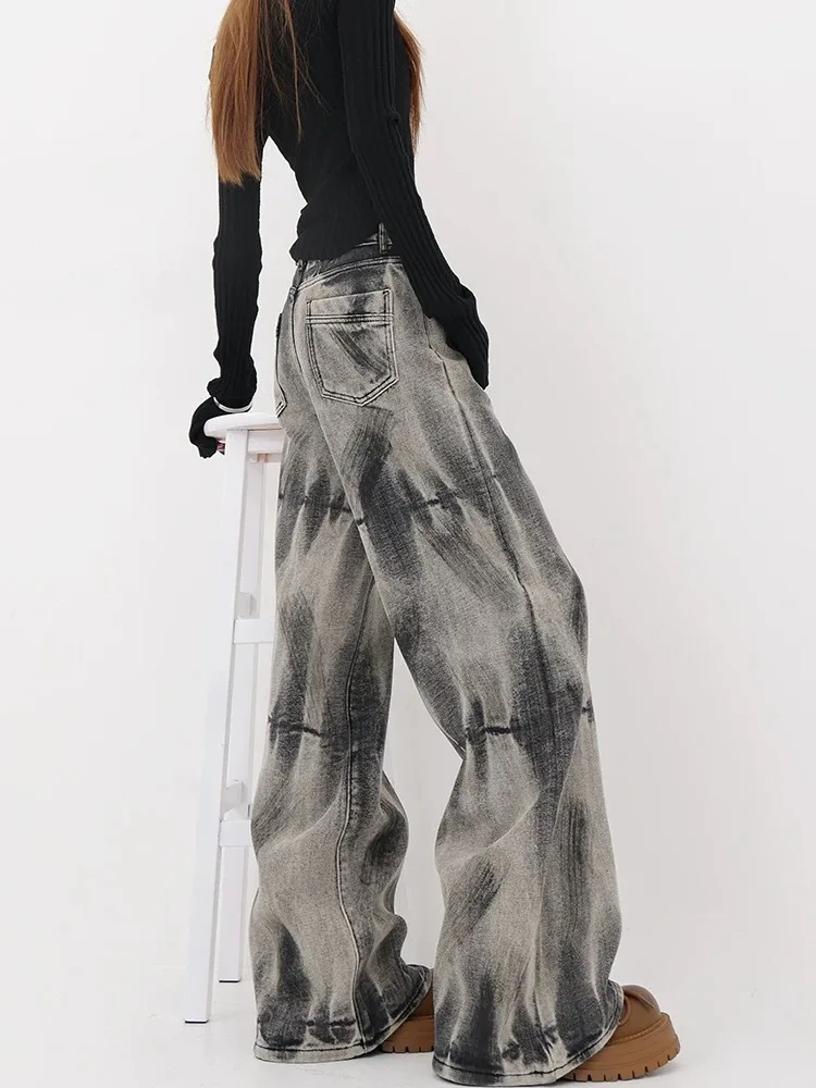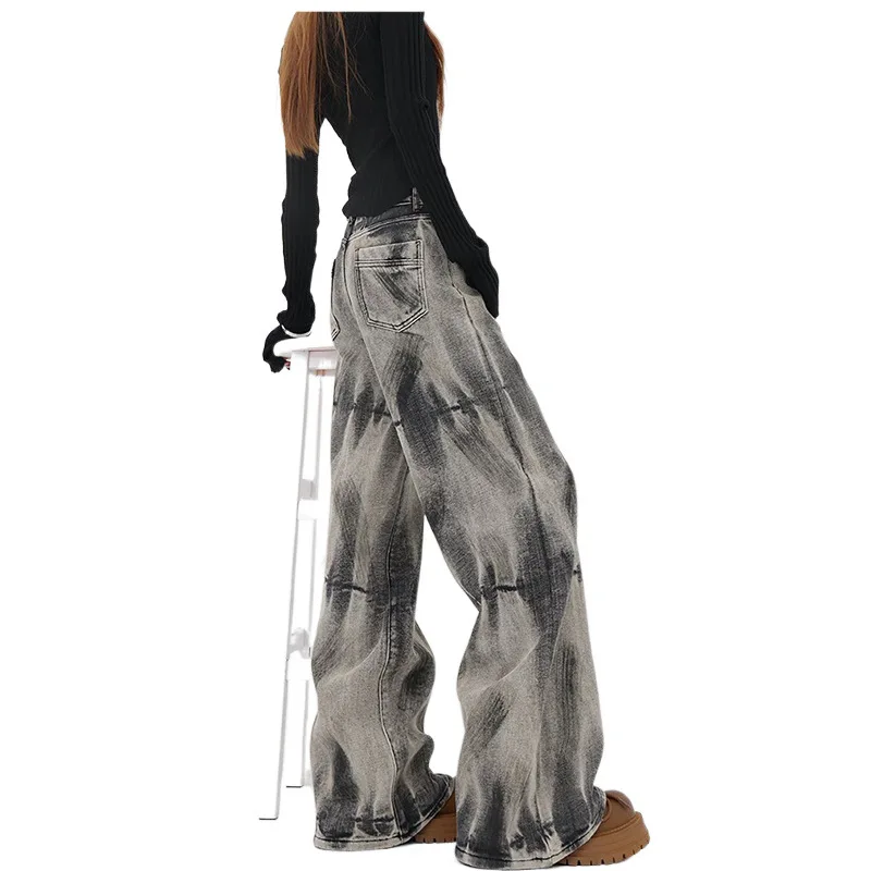 American Style Retro Distressed Tie-Dye Wide Leg Jeans Women's Wasteland Style Loose Drape Floor-Length Summer Quick Denim