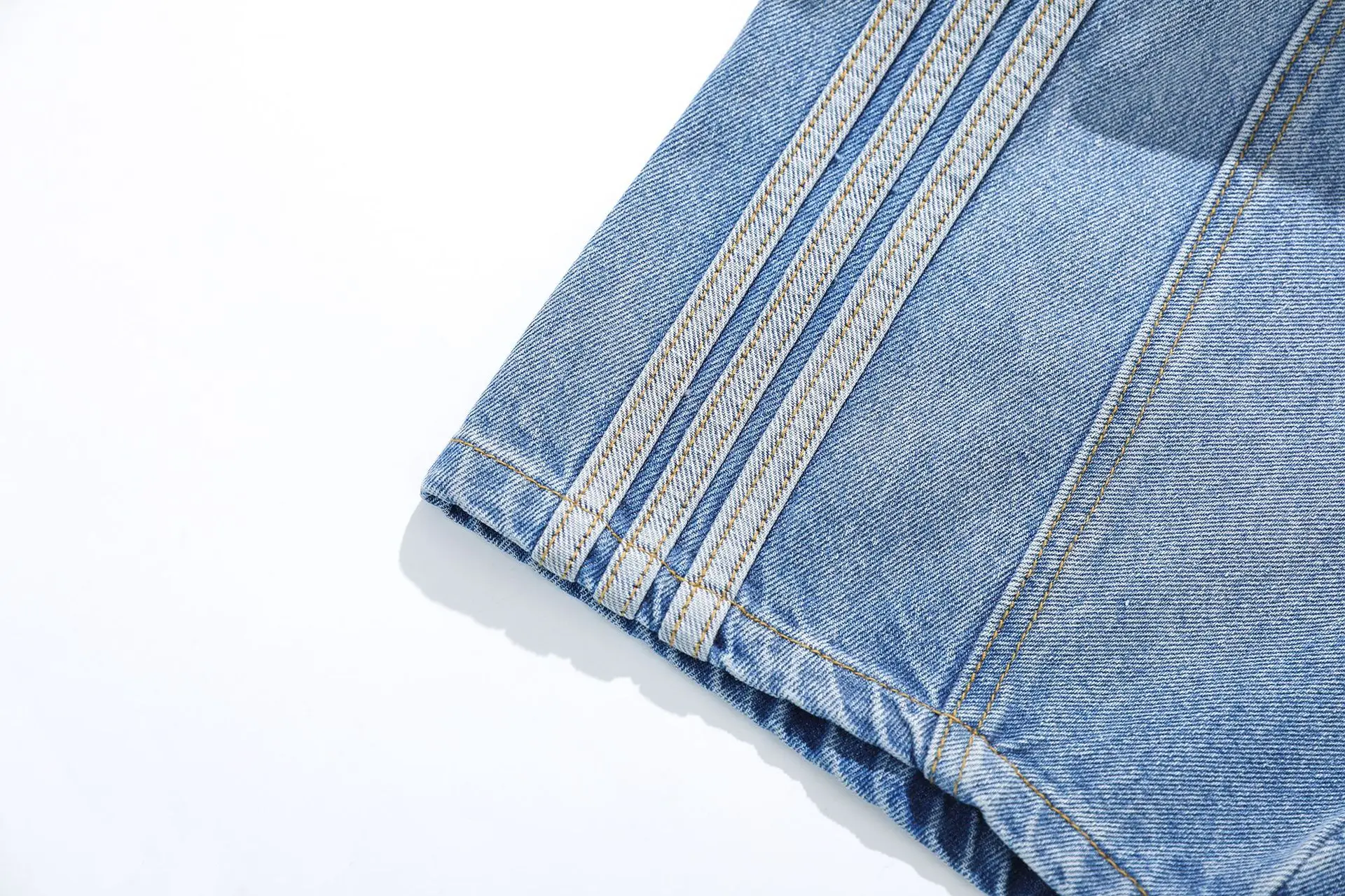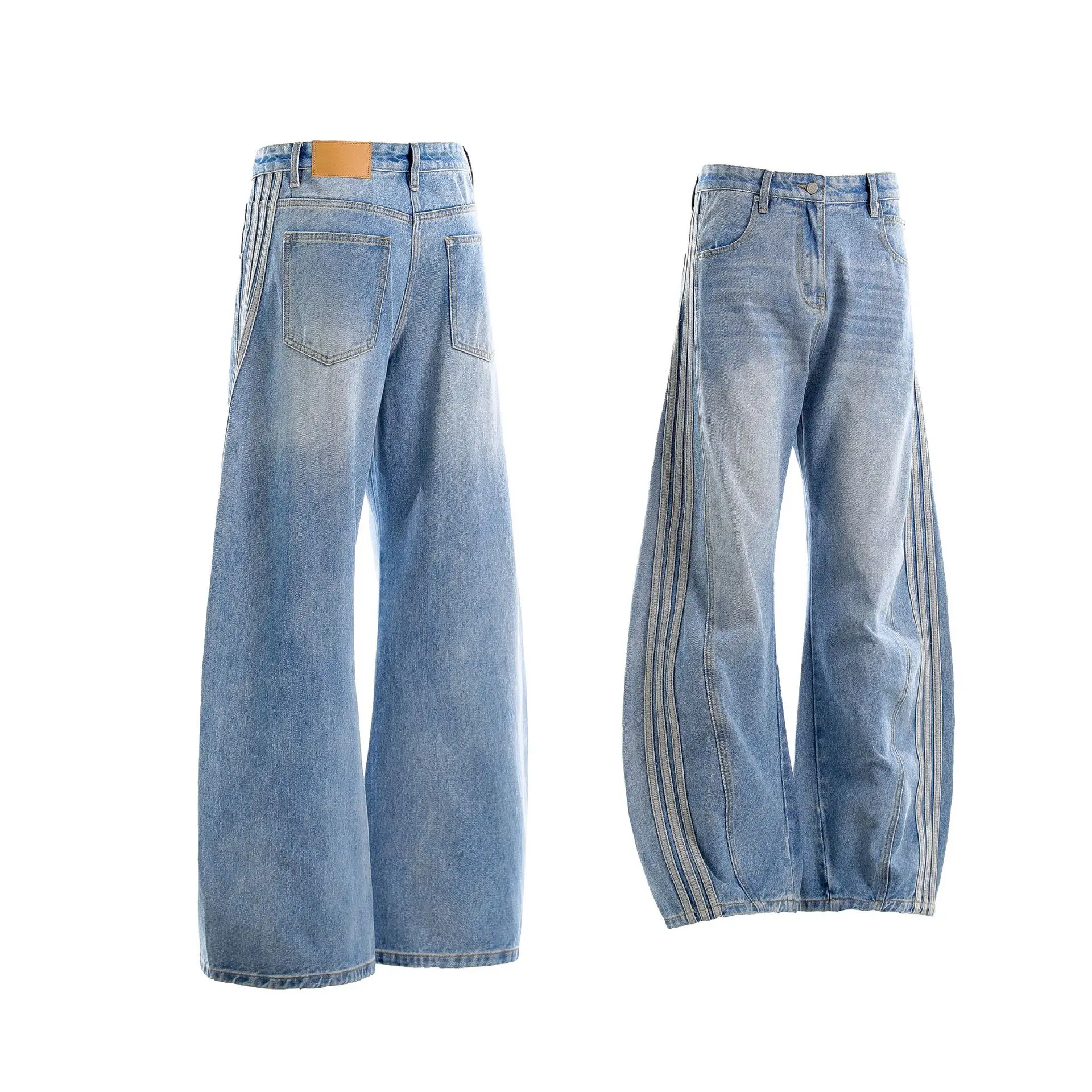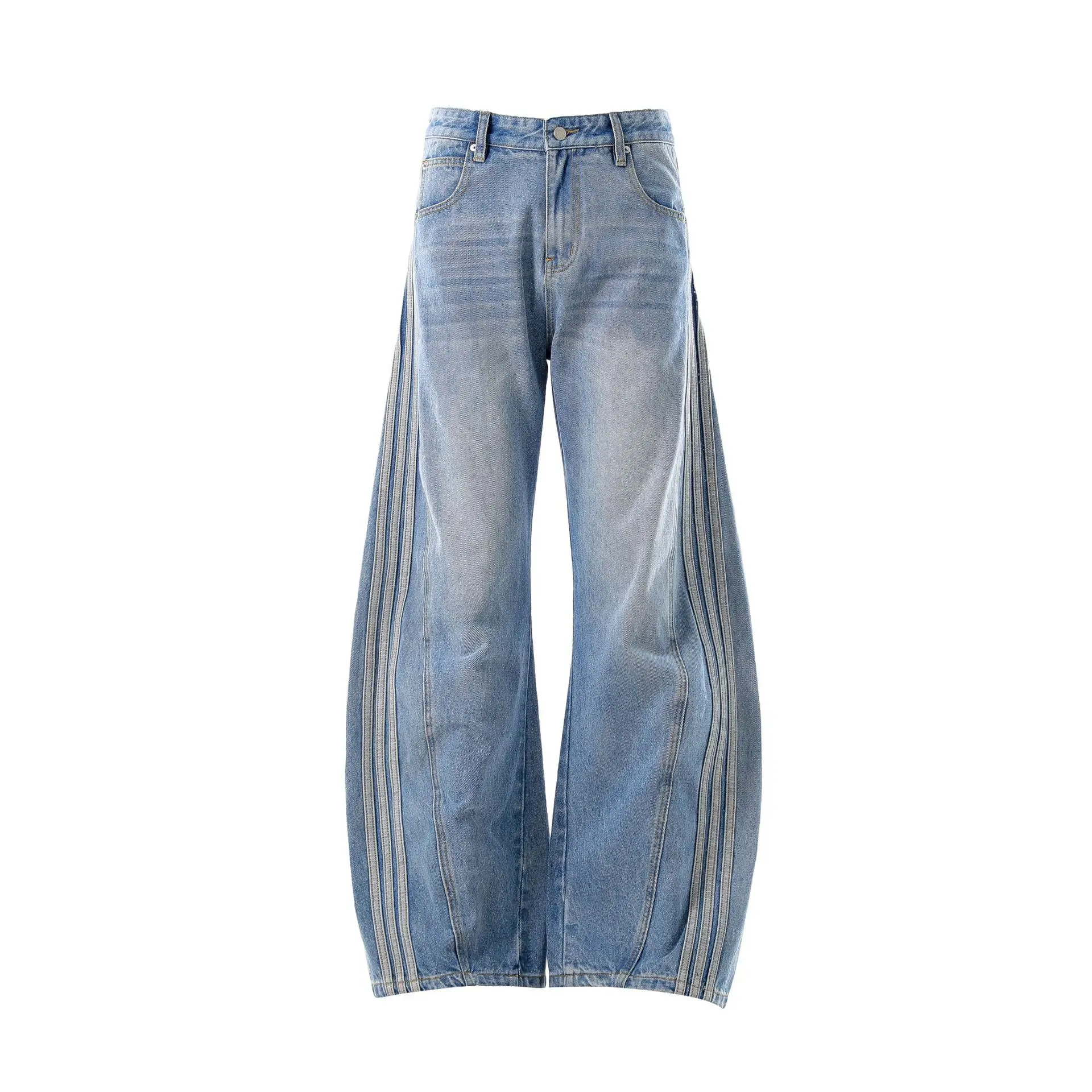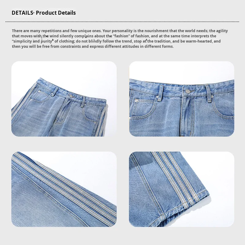 American Style Vintage Medium Wash Distressed Three-bar Straight Jeans Men's and Women's Summer New Boot Cut Katana Pants