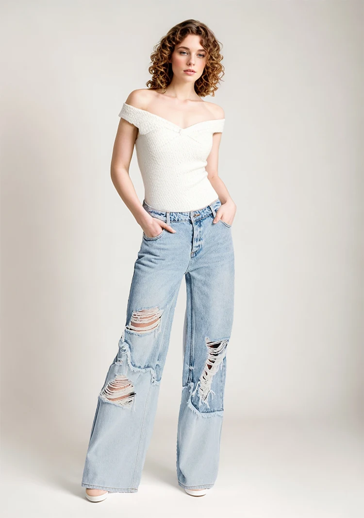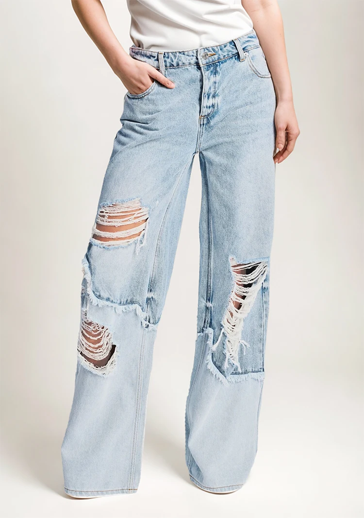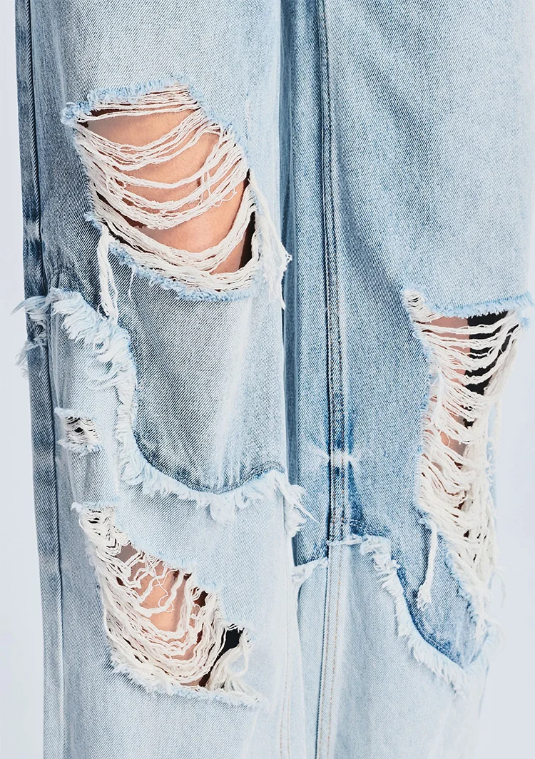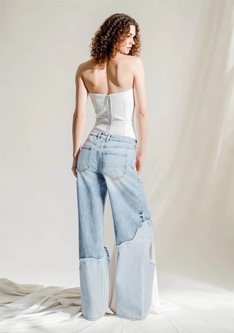 Custom Wholesale 2024 Women's New Casual Sex Appeal Breathable Denim Patchwork Rough Selvedge Ripped Hole Washed Straight-leg