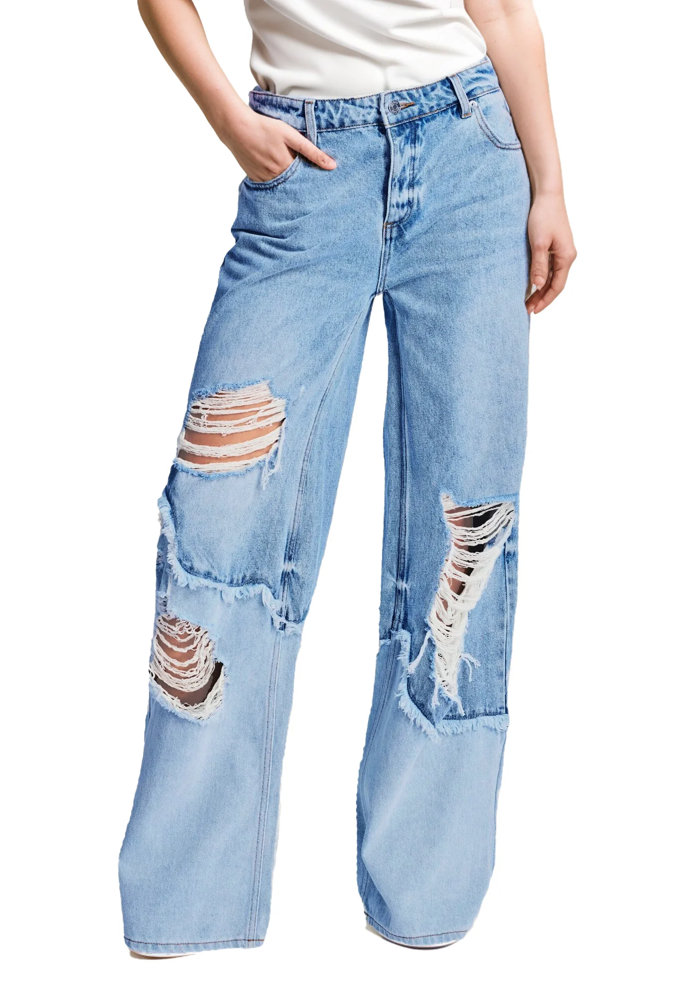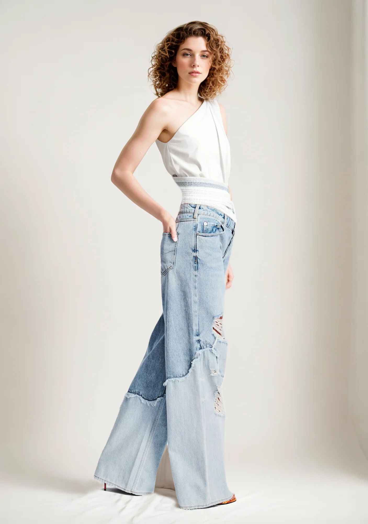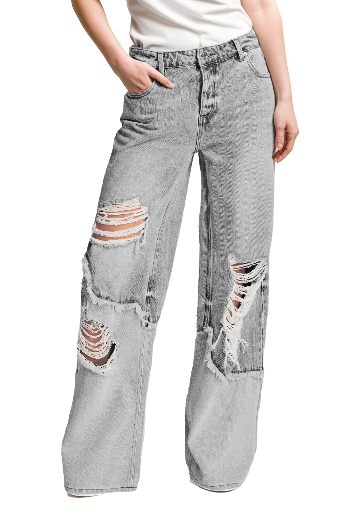 Custom Wholesale 2024 Women's New Casual Sex Appeal Breathable Denim Patchwork Rough Selvedge Ripped Hole Washed Straight-leg