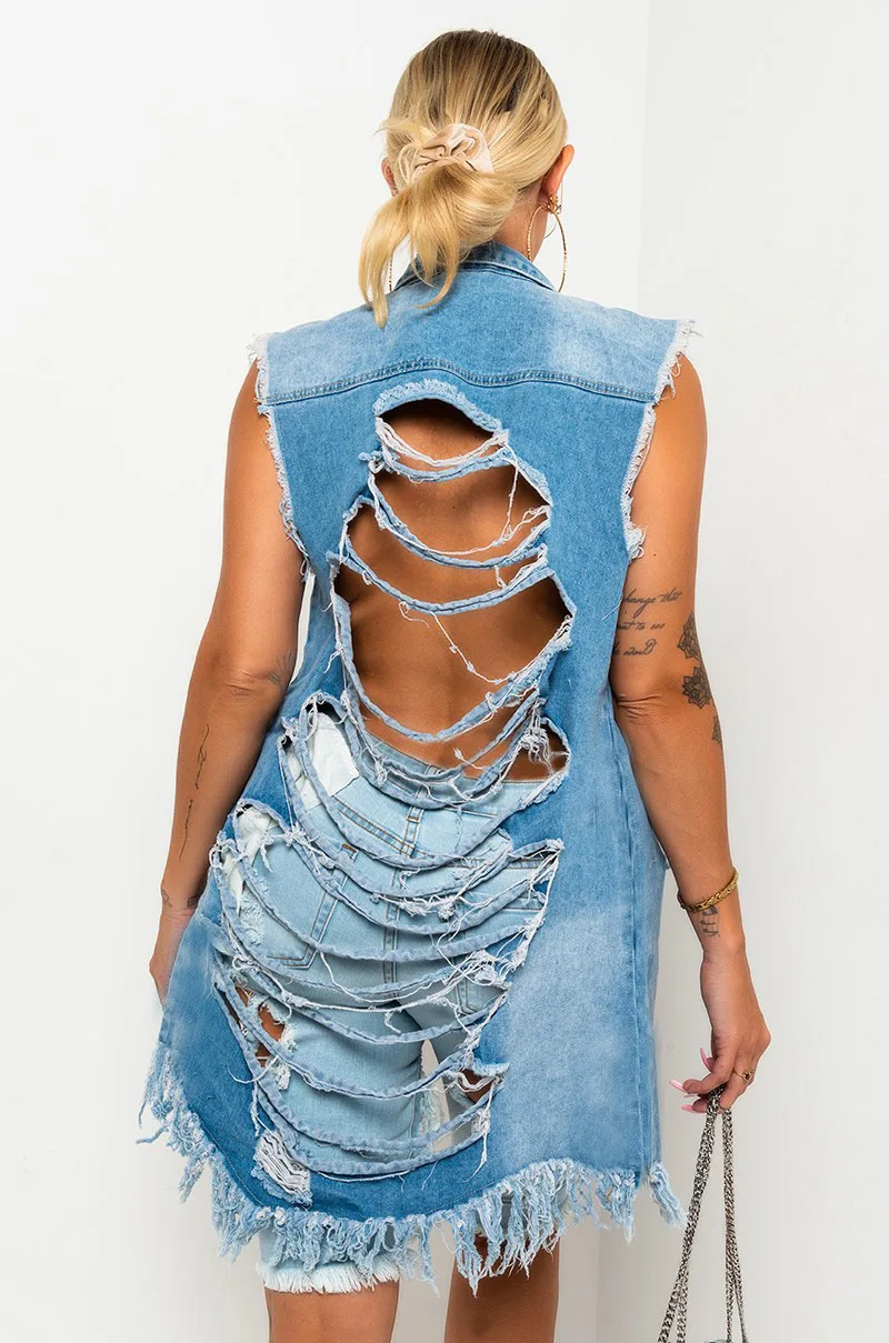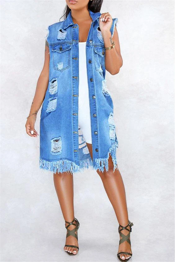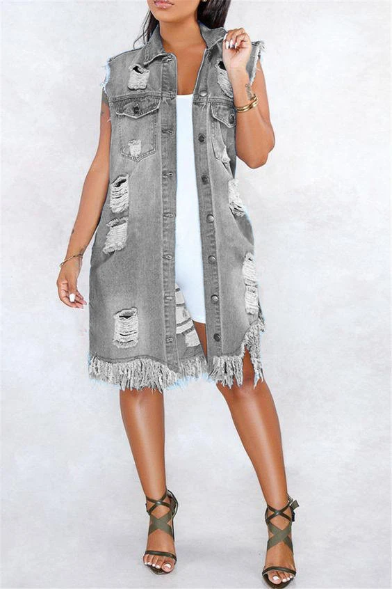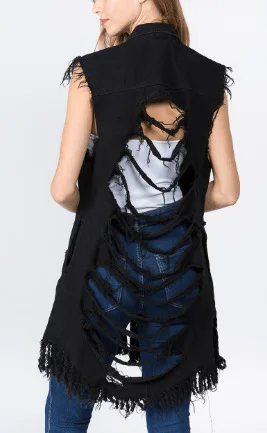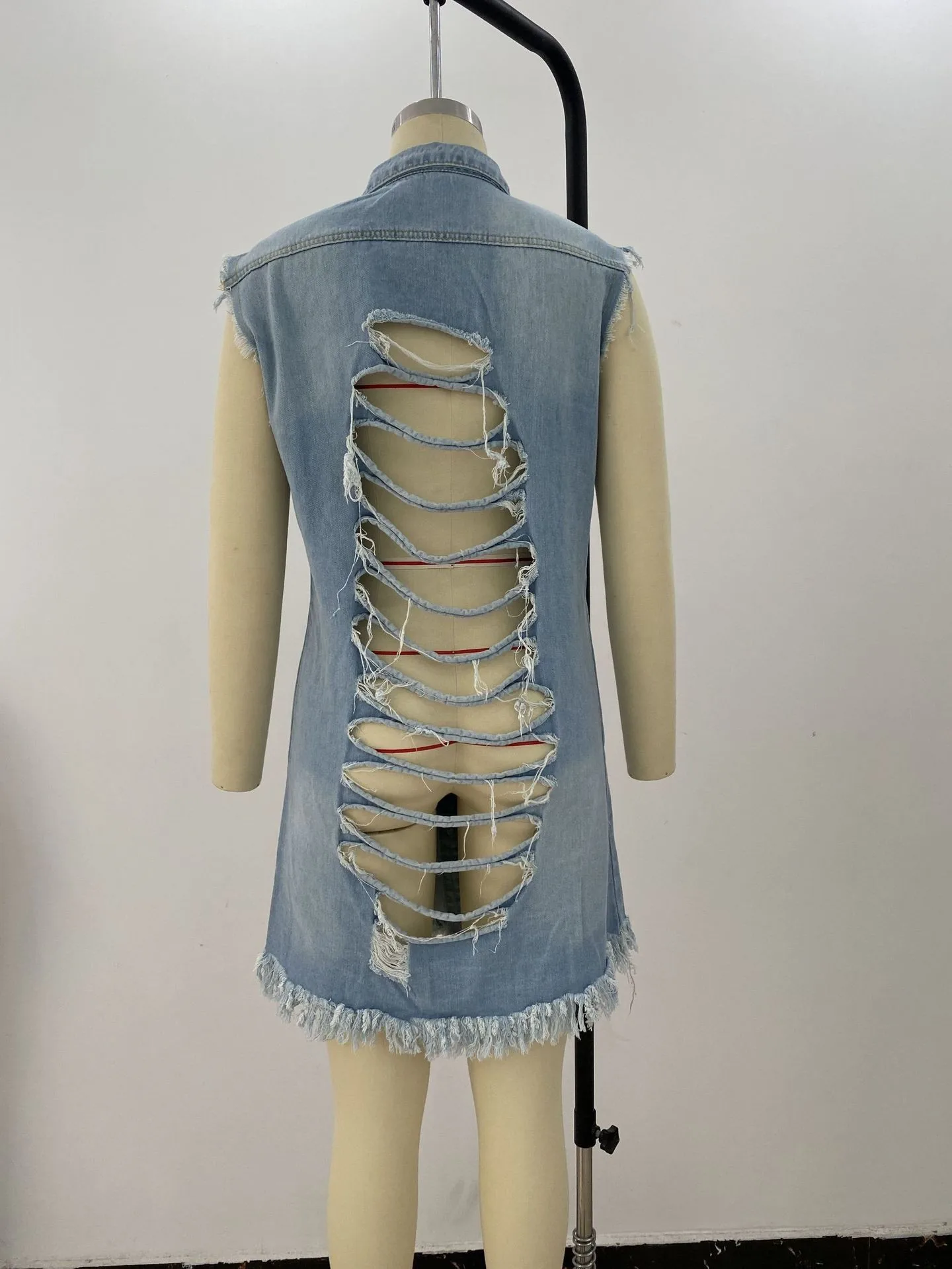 Custom Long Jean Jacket Women Oversized Destroyed Denim Fringe Jacket For Ladies Hollow Out Button Long Denim Coat