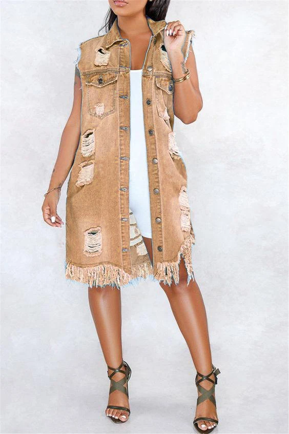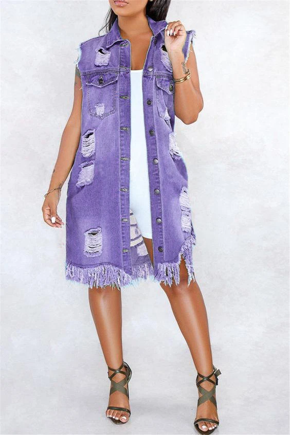 Custom Women's Breathable Printed Long Jean Jacket Oversized Destroyed Denim Fringe with Hollow Out Buttons