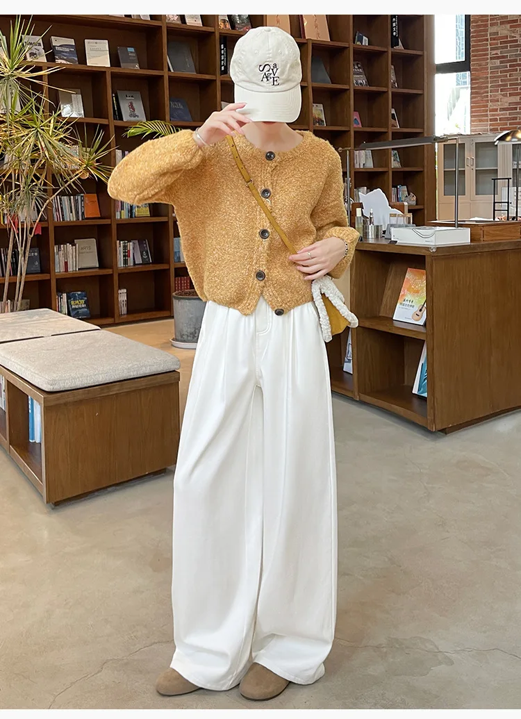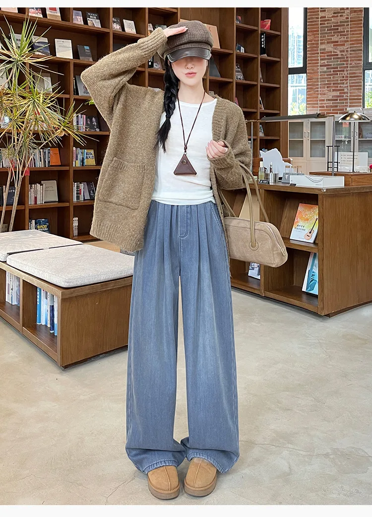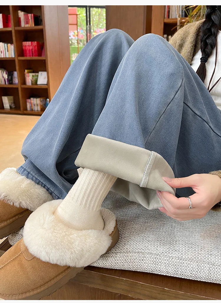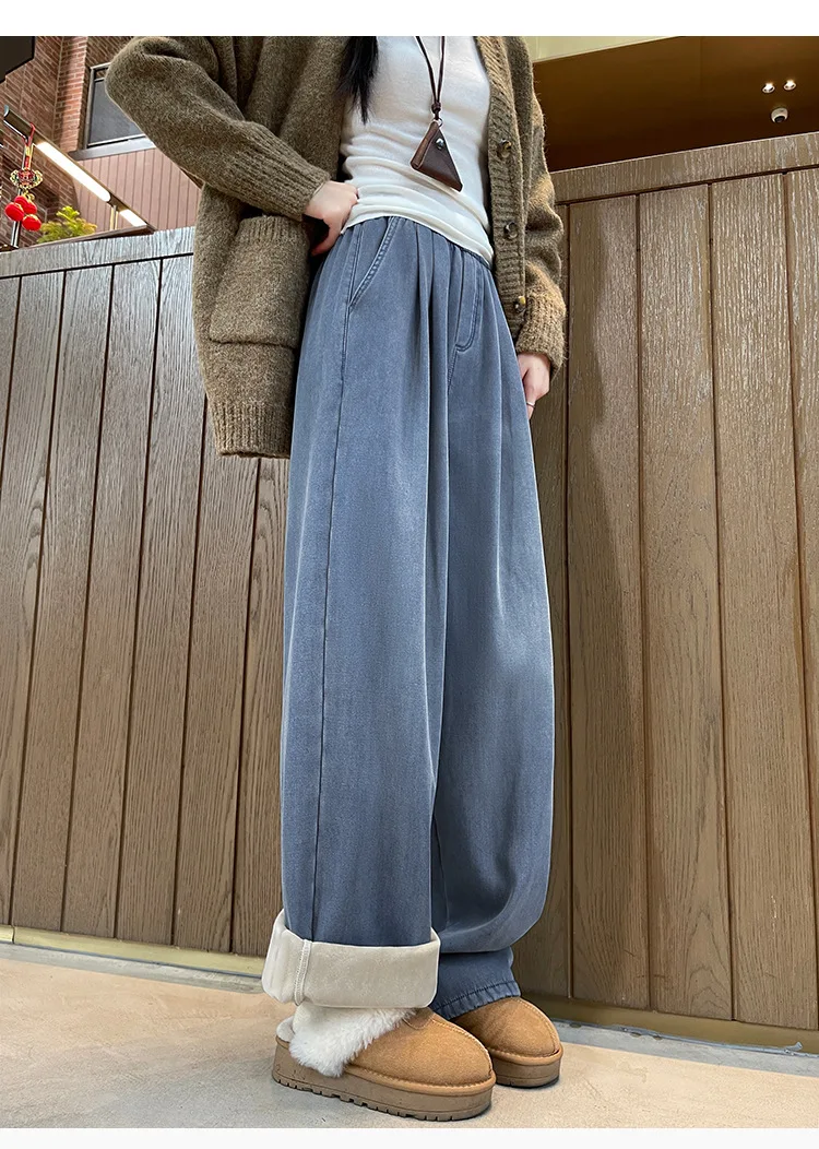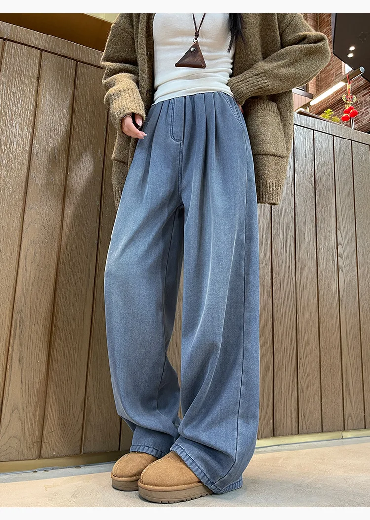 Denim Fleece-lined Women's Autumn Winter New High Waist Drapey Loose Straight Slimming Petite Wide-leg Quick Dry Vintage