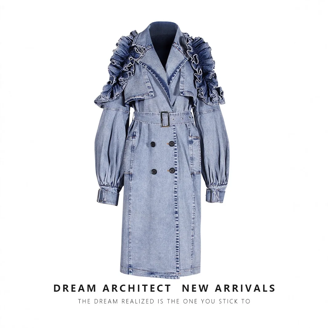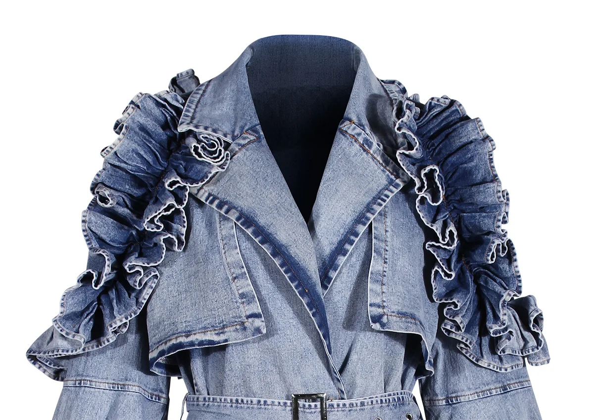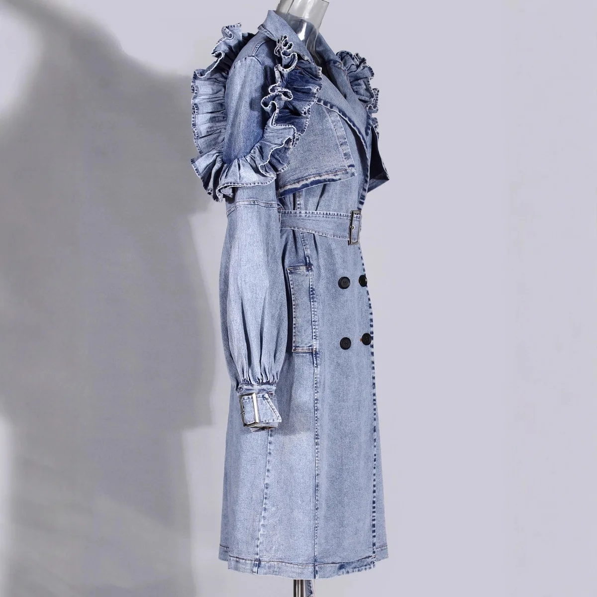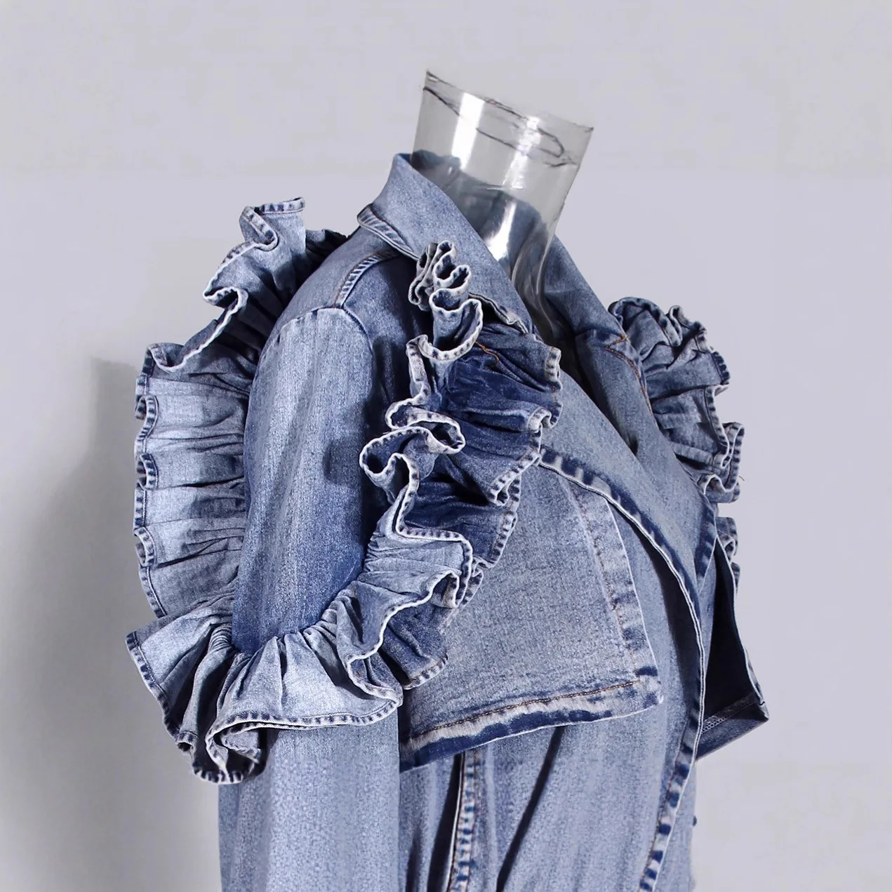 European American Style Vintage Denim Poncho Autumn Winter New Women's Fashion Waist-Cinching Puff Sleeve Coat