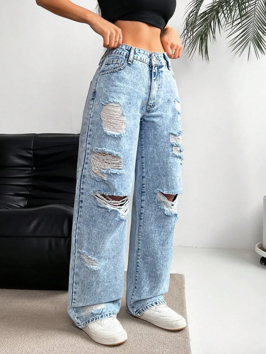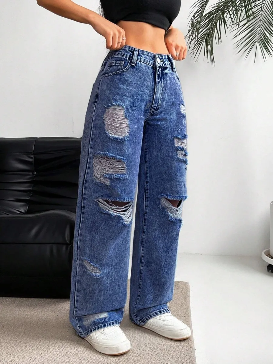 European and American Denim Ripped Washed High Waist Straight-leg Versatile Slimming Spring Jeans for Women