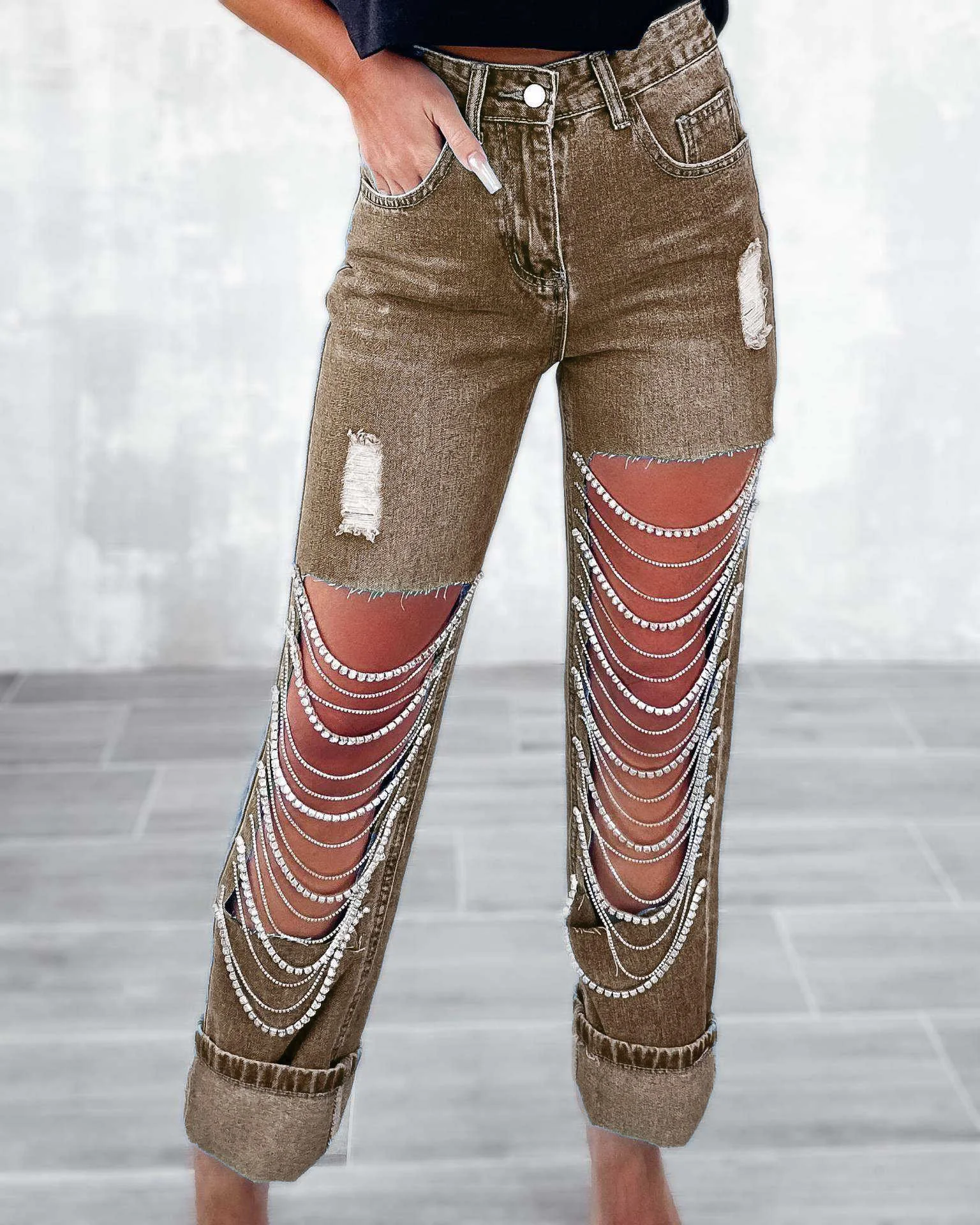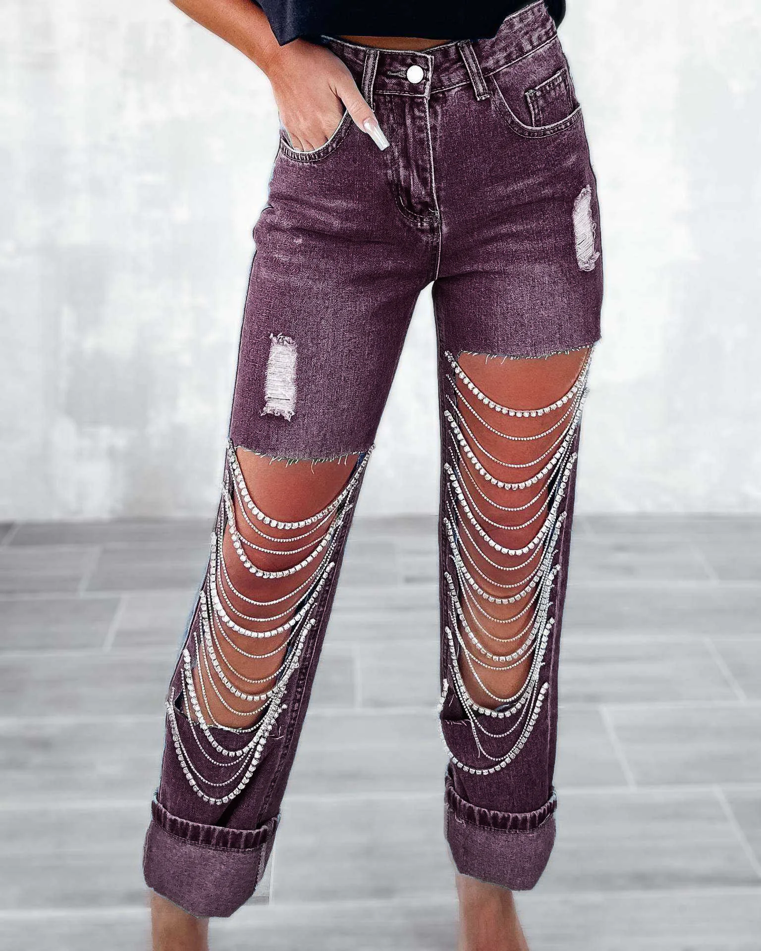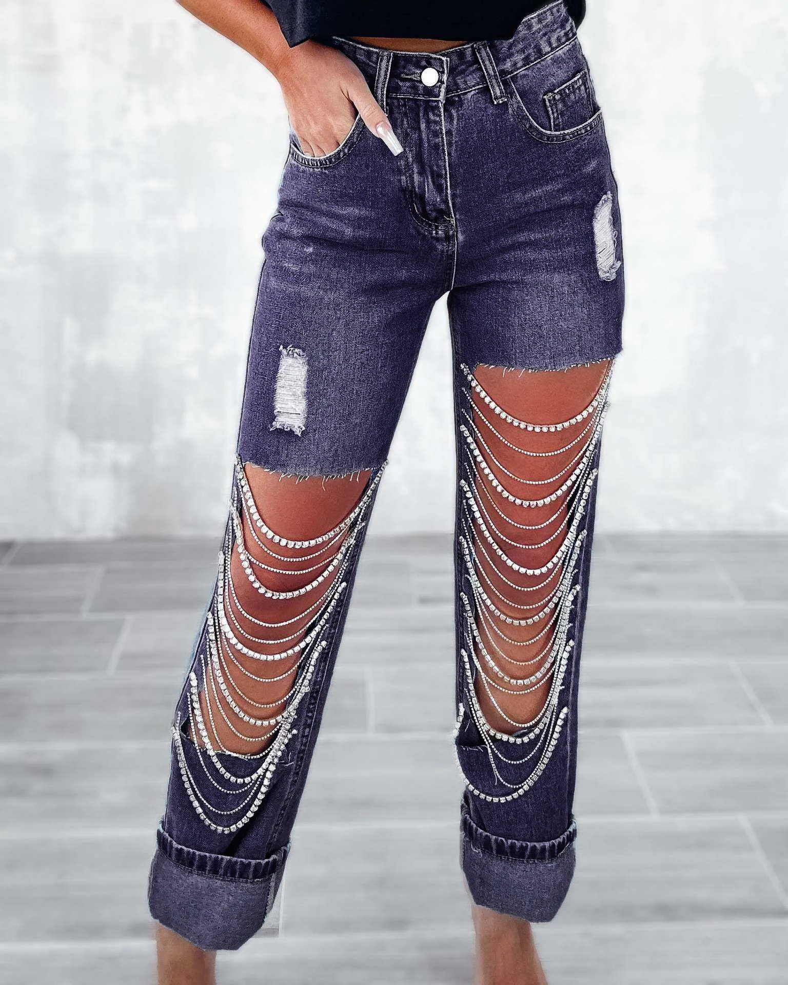 2024 Fall Straight Jeans Women Holes Diamond Rhinestones Chains High Waist Fashion Streetwear Tassel Women Denim Pants Jeans