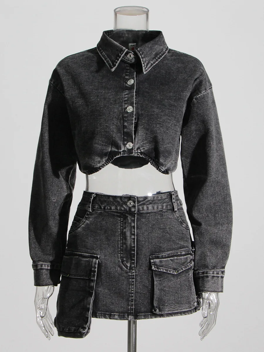 High Quality Women's Denim Jacket Outfits Stretch Cotton Crop Jacket Shorts Solid Knee Long Matching Two Piece Jeans Skirt Set