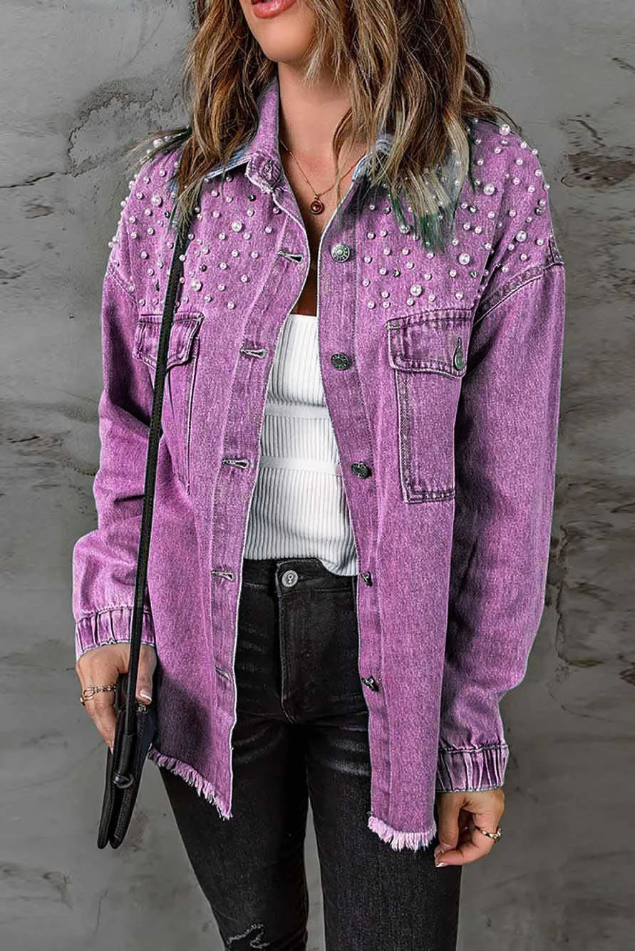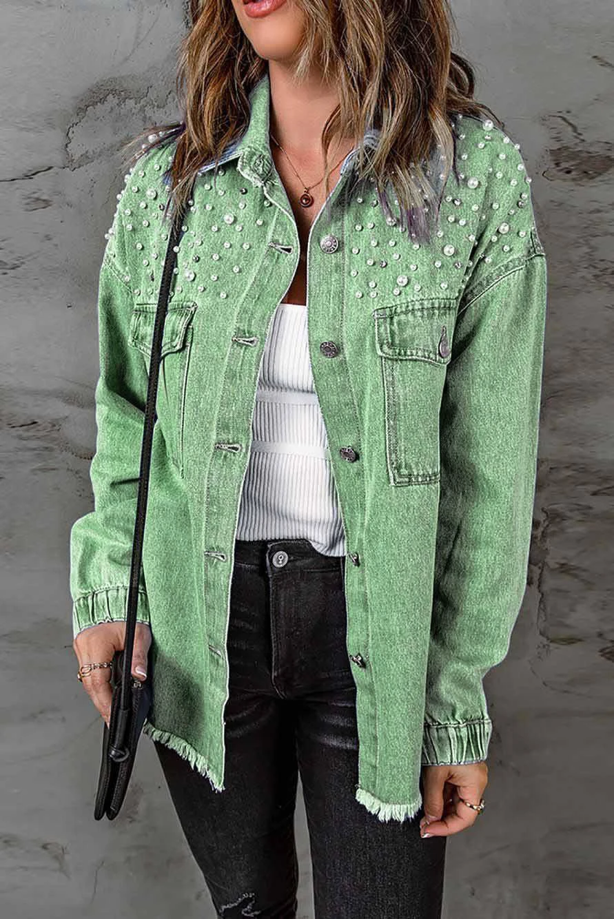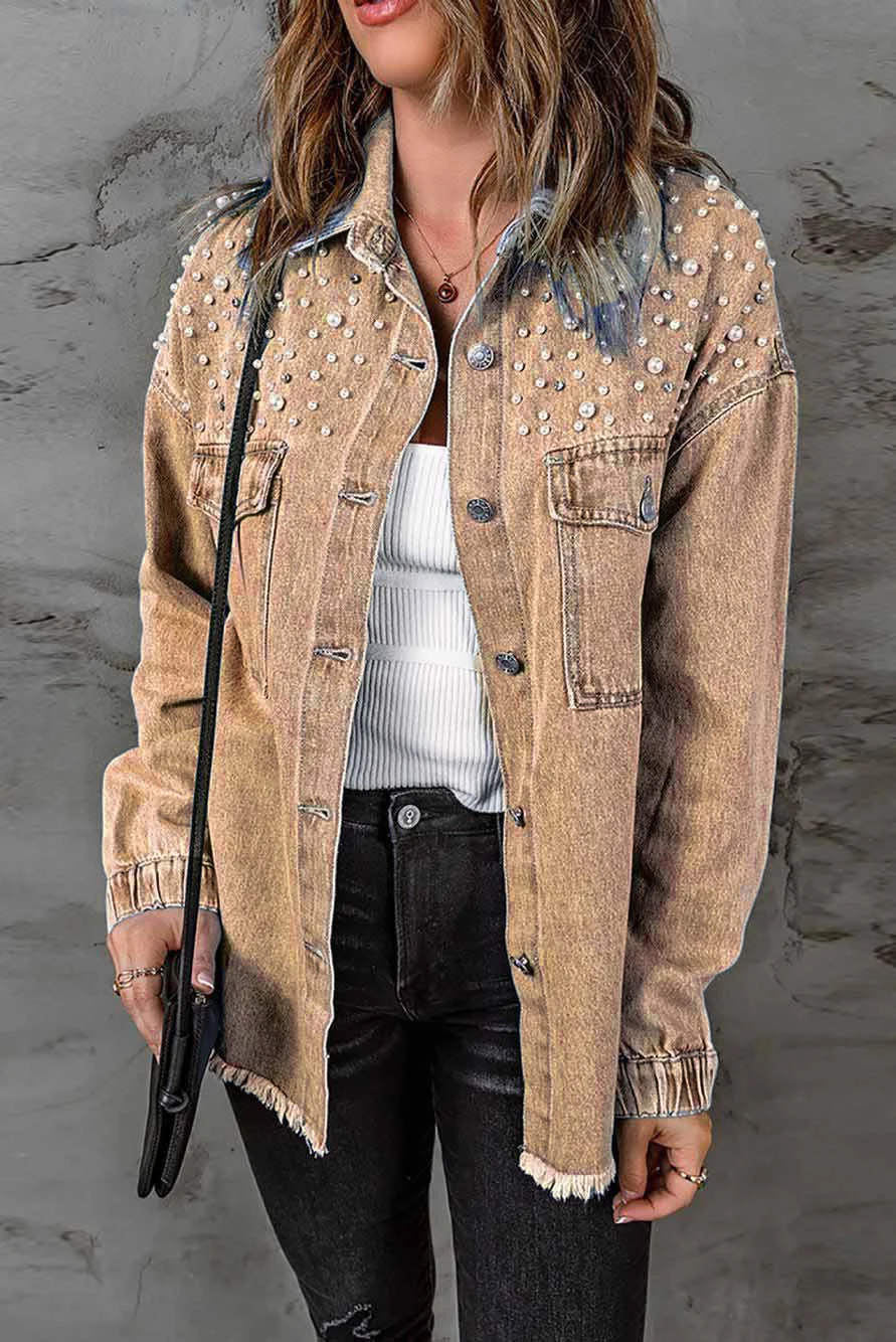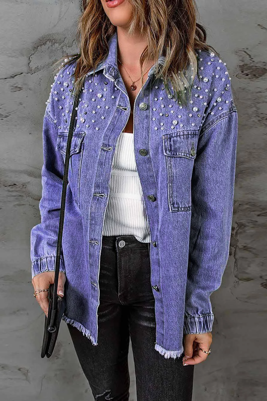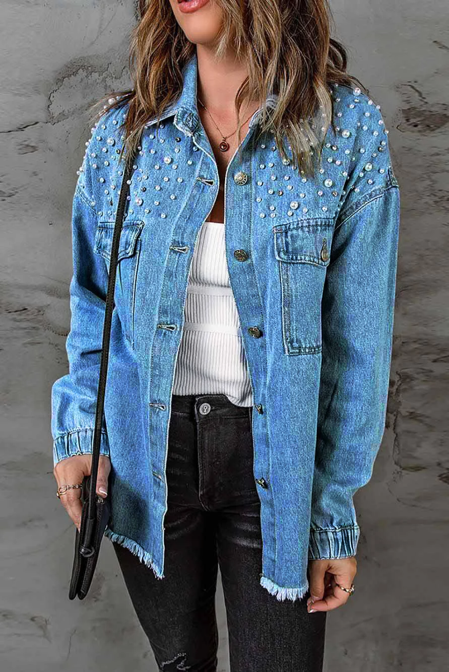 Ladies Denim Jacket Long Sleeve Raw Fringe Pearl Women Jacket Wholesale Large Size Coat