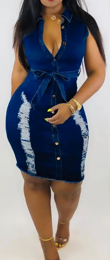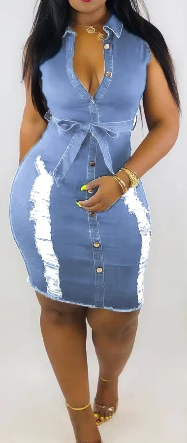 Latest Sleeveless Turn Down Collar Denim Dress Women Casual Dresses Jeans Dress