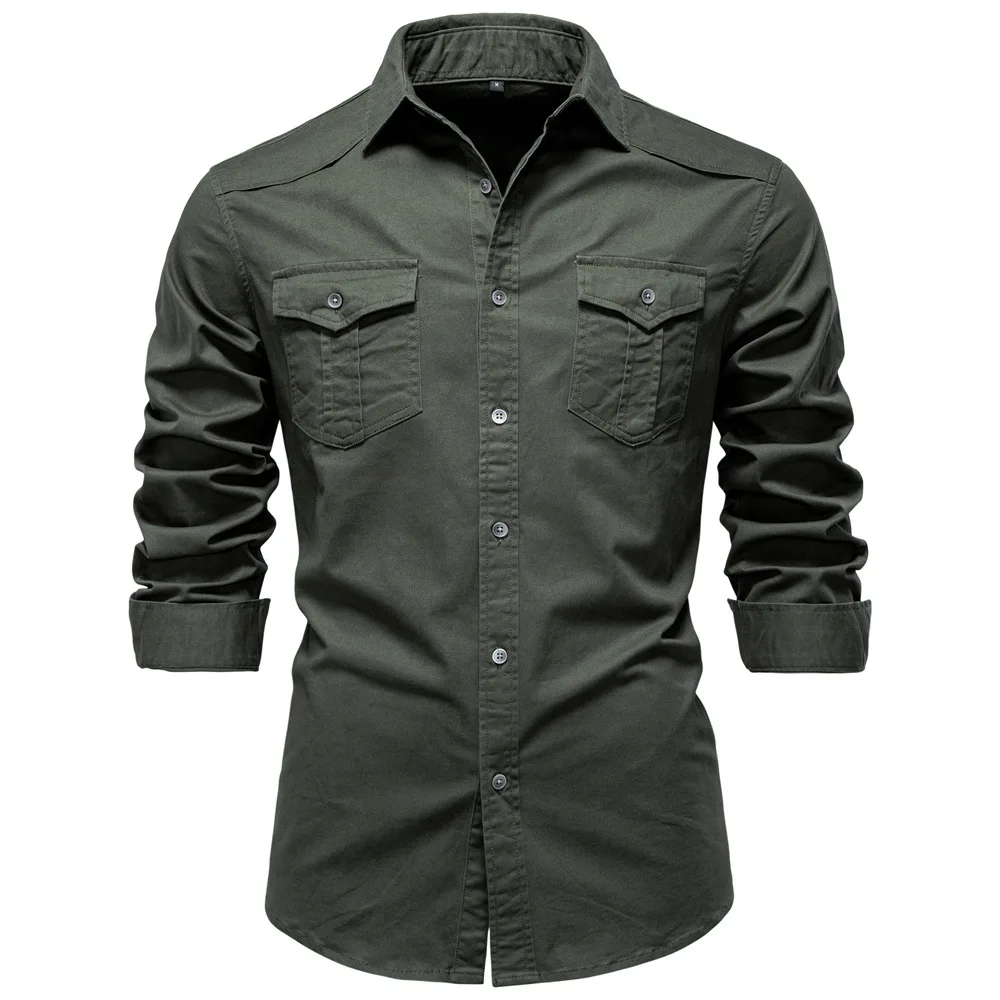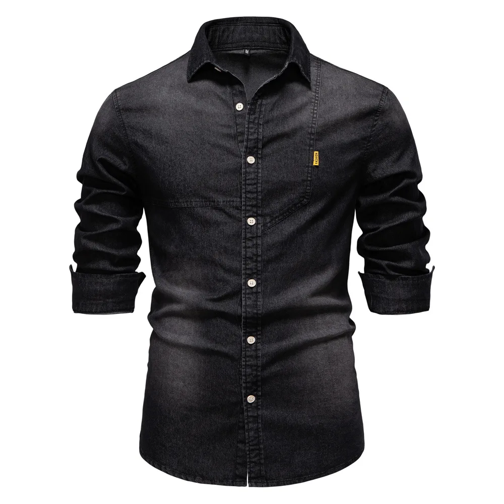 Men's Clothing European Size Denim Shirt Casual Solid Color Long Sleeve 100% Cotton Pocket