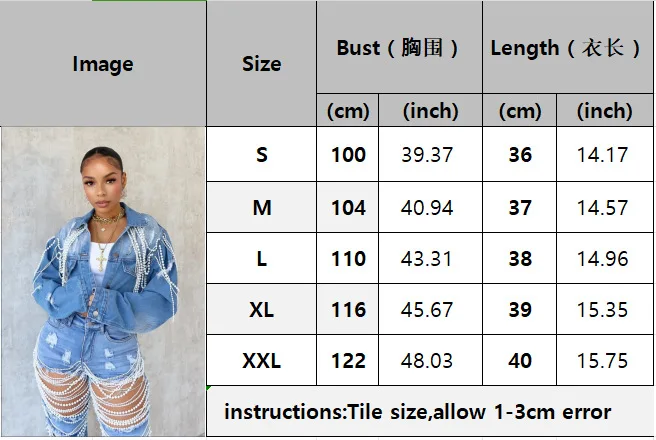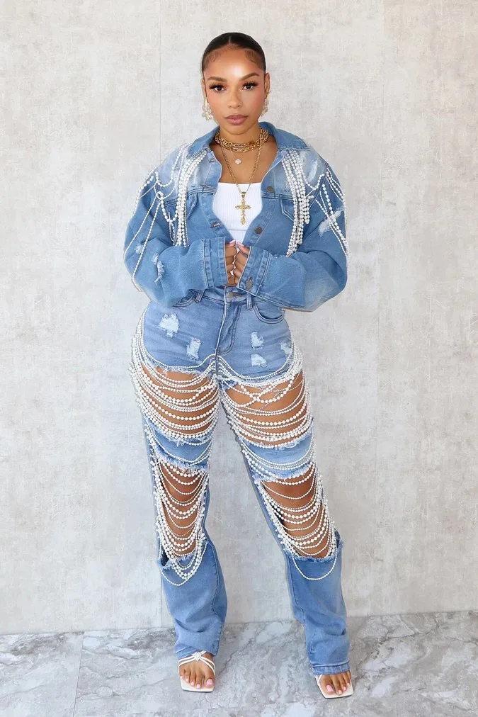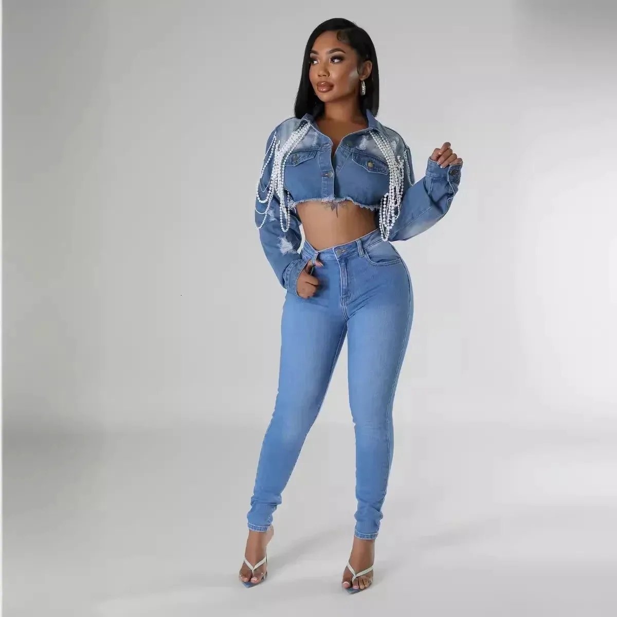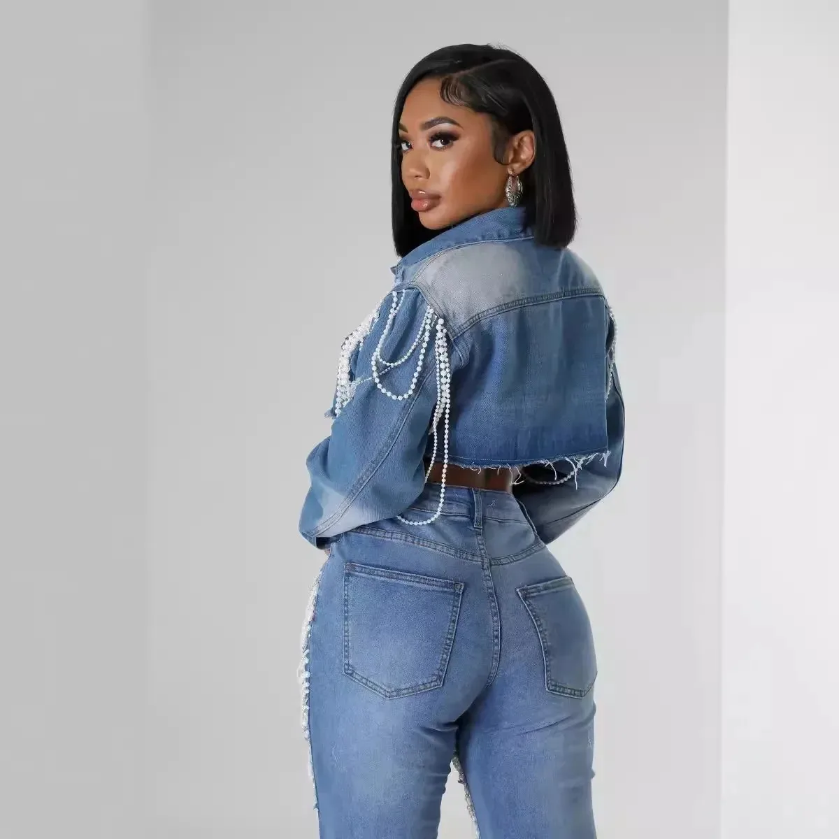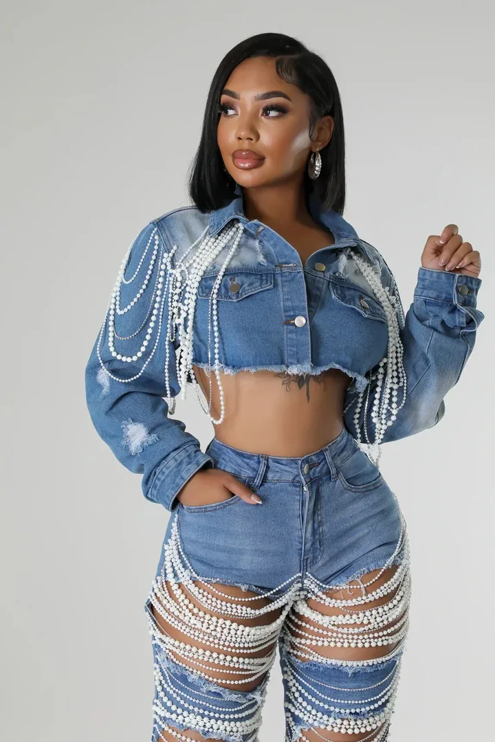 New Fashionable Pearl Chain Decoration Women Denim Jacket Turn Down Collar Crop Top Ripped Jeans Jacket for Women