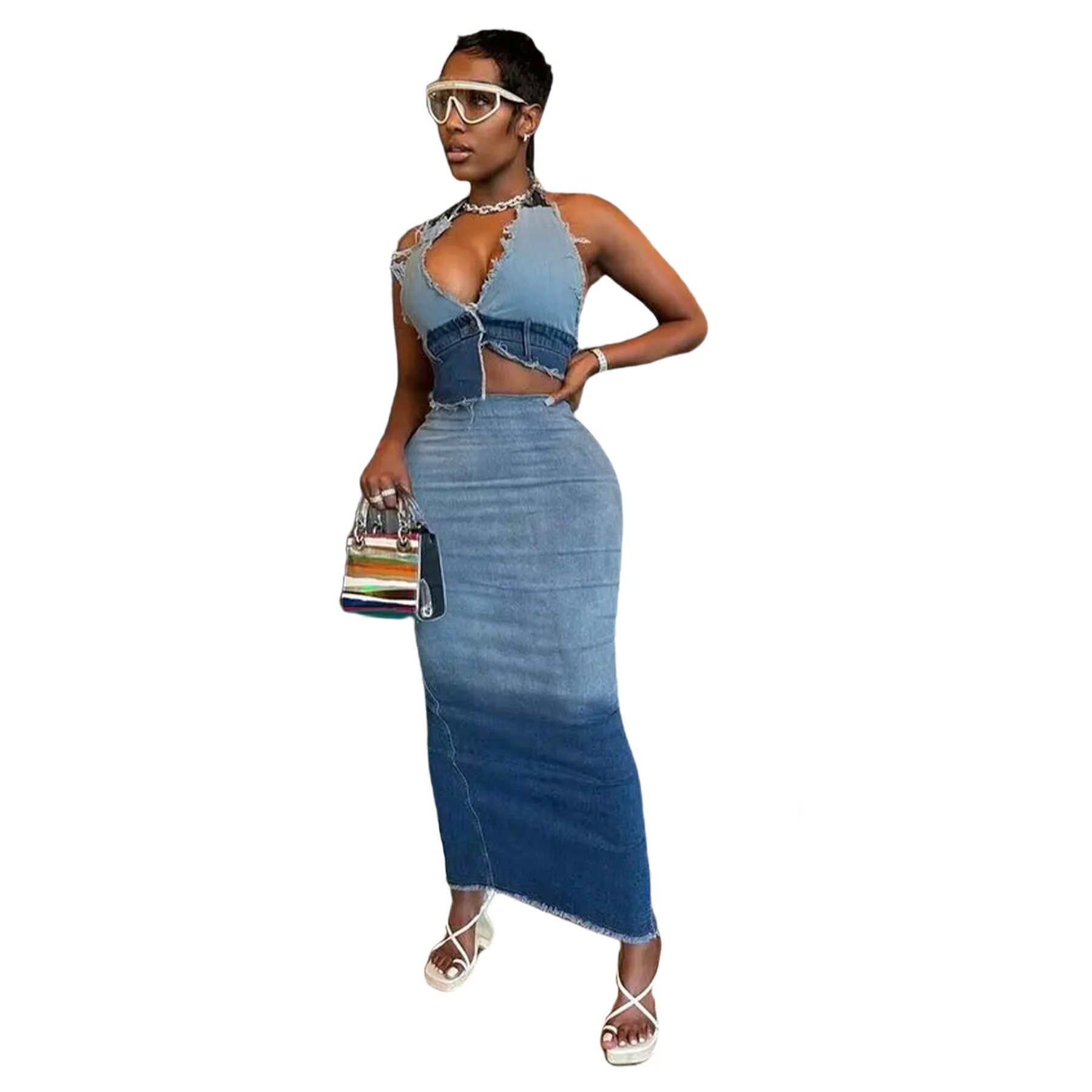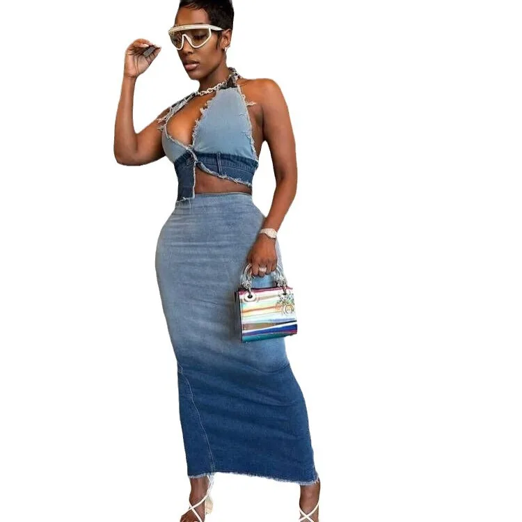 New Women's Vintage Denim Skirt Set European American Style Sleeveless Halter-Neck Lace-Up Backless Gradient Color Set
