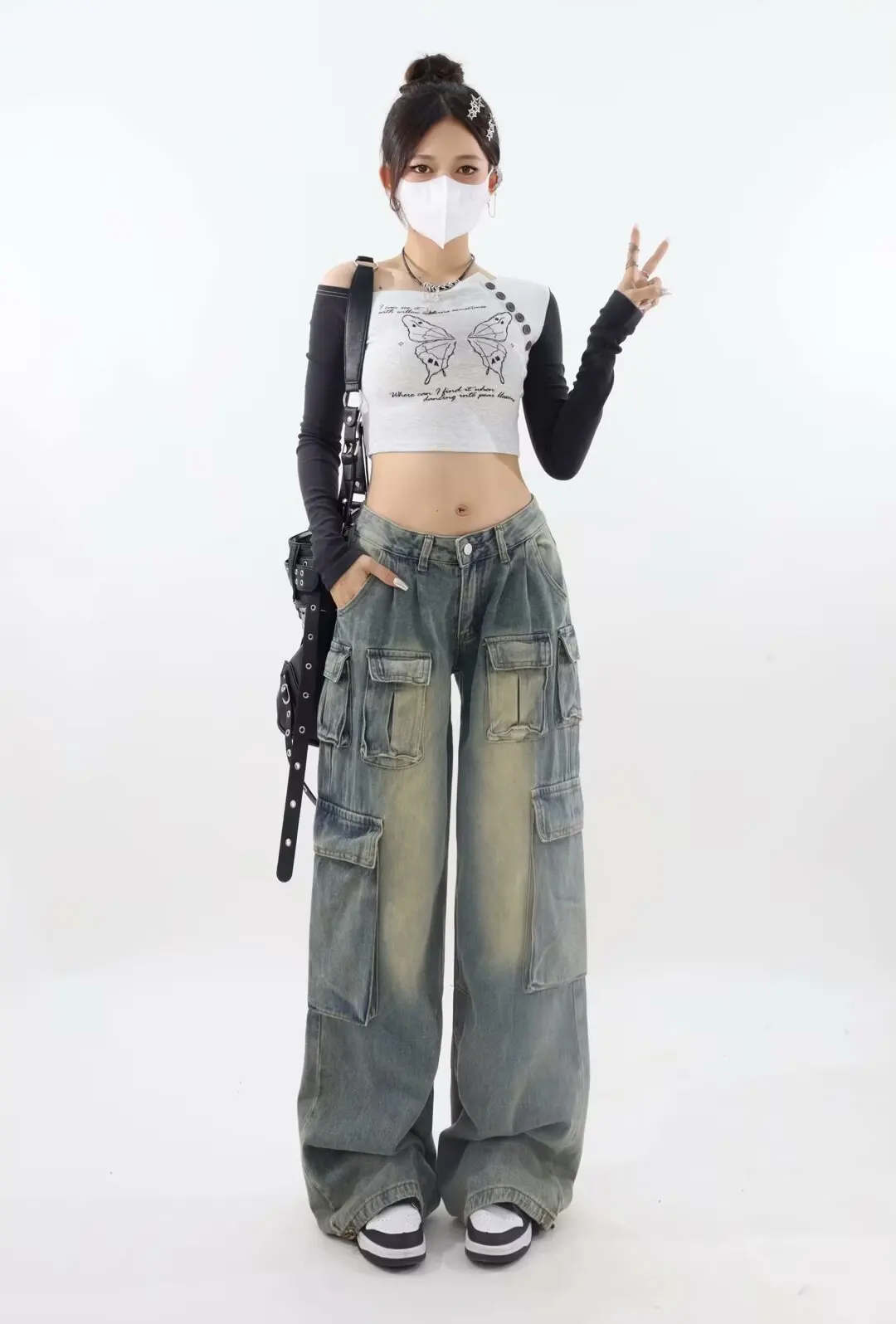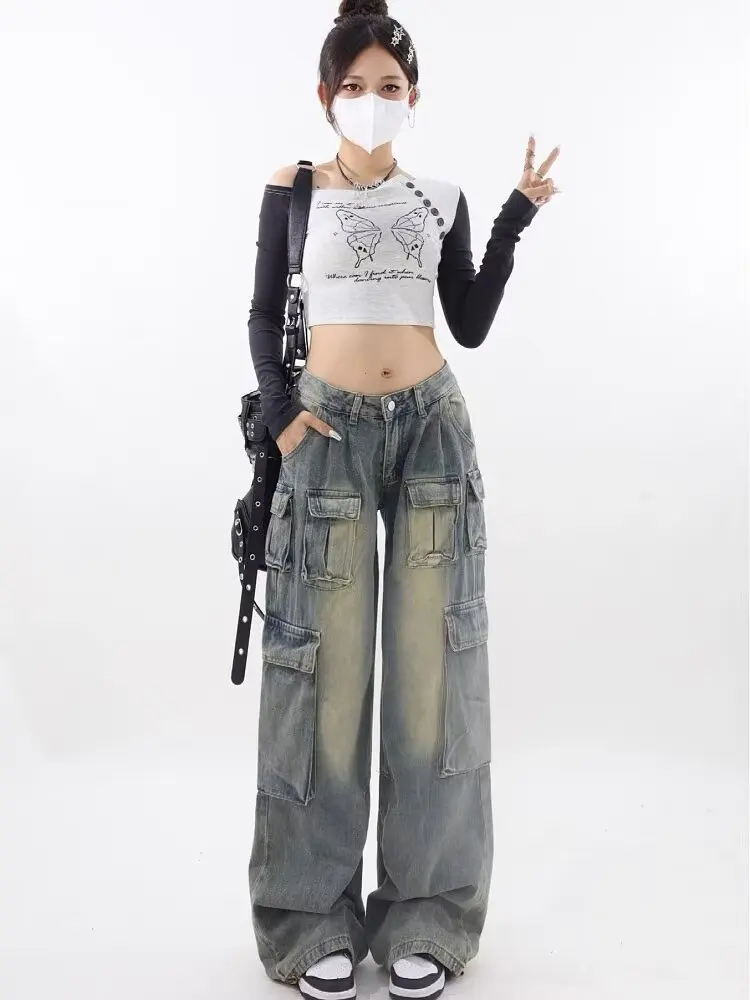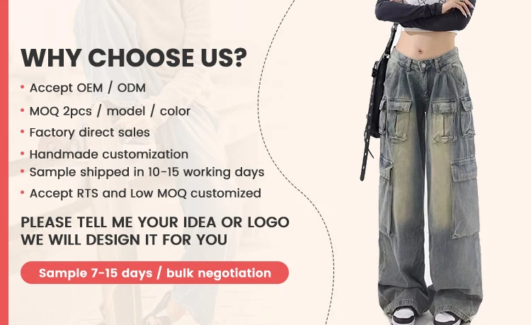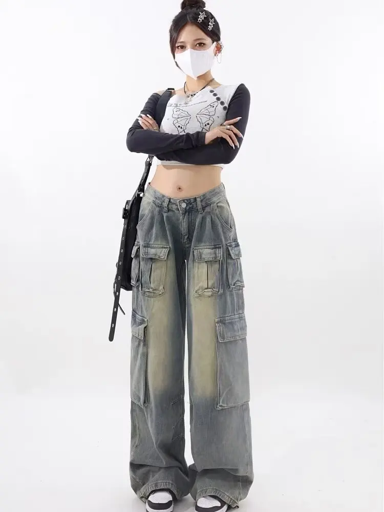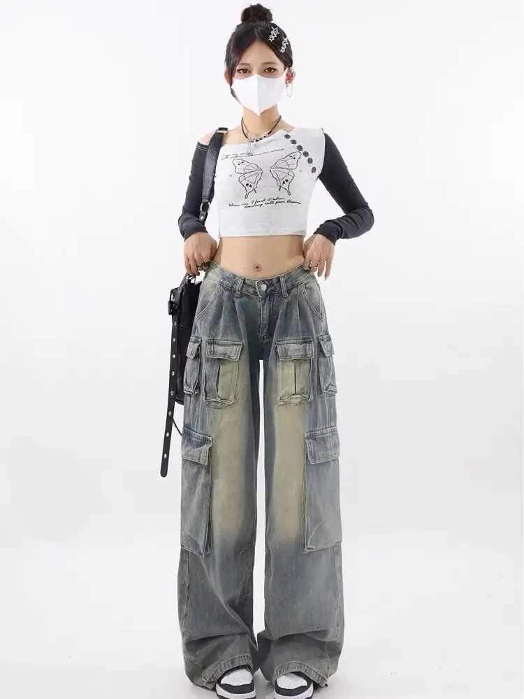 ODM Supply High-Waist Multi-Pocket Cargo Pants Vintage Bleached Jean Denim Trousers Light Washed Woven Summer Pants for Women