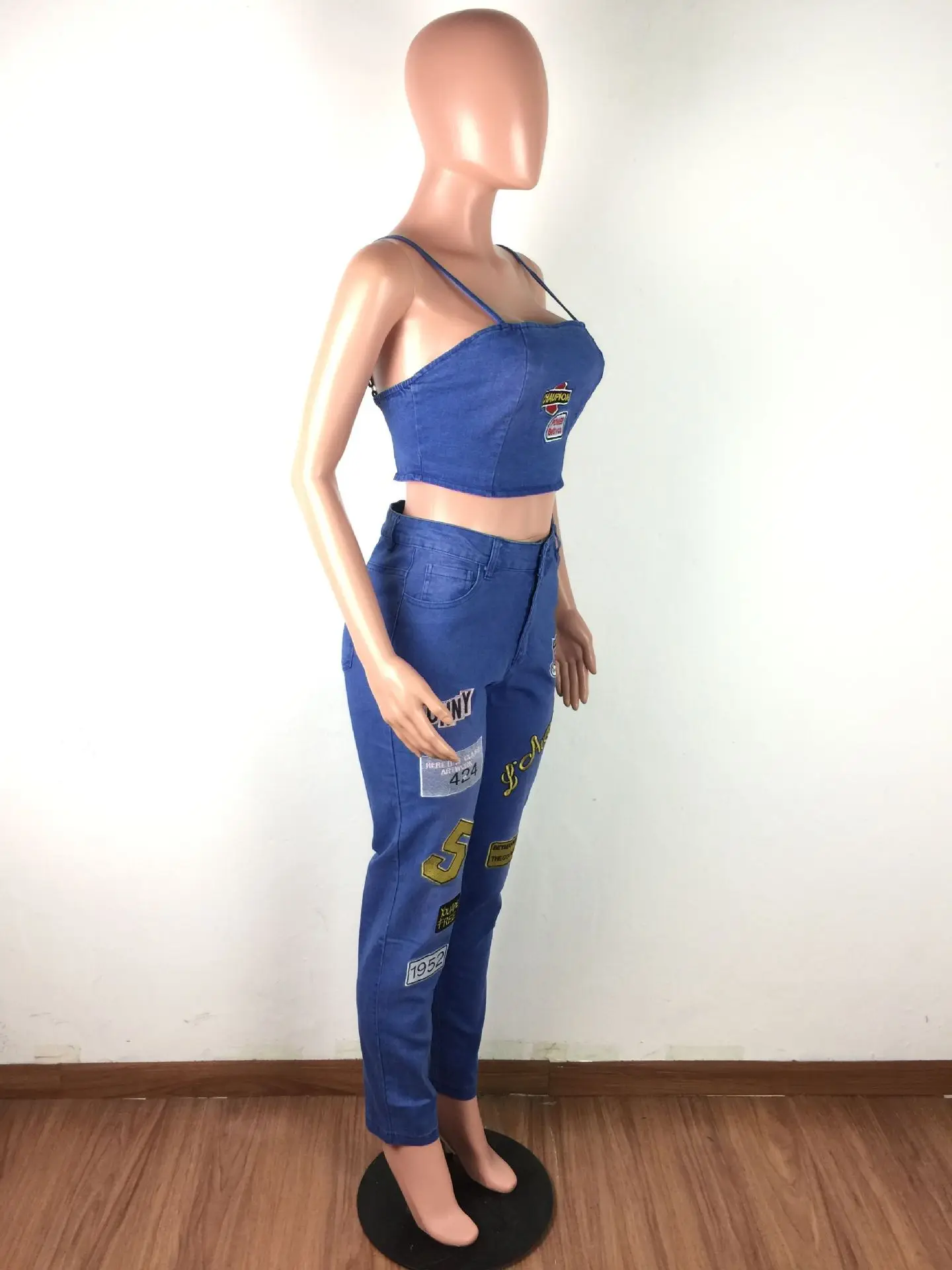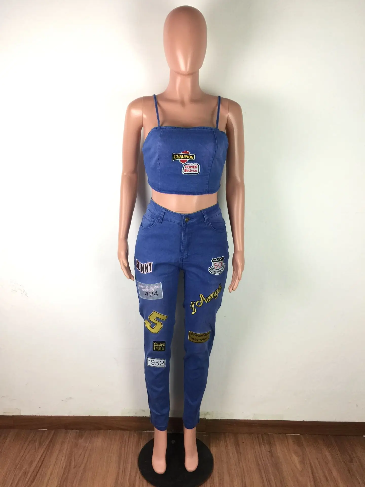 Off Shoulder straight strap Tops With Jeans trousers Fashion latest design sequin cartoon St'y'le Two Piece Sets Jeans For women
