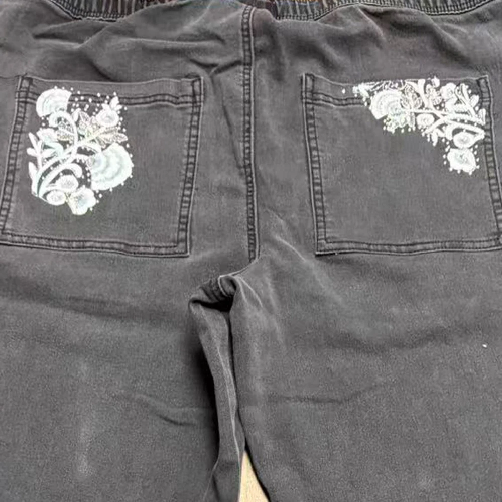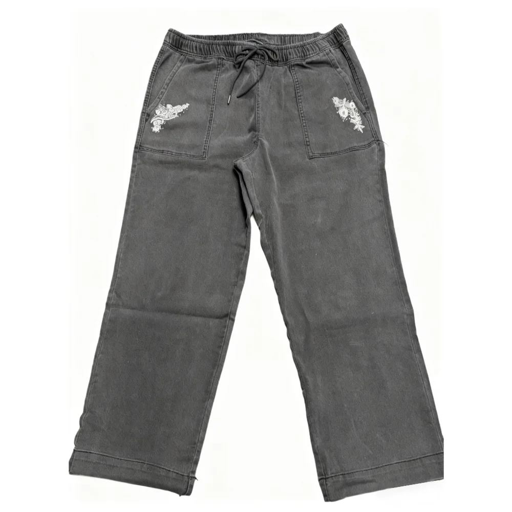 Plus Size Floral Embroidered Women's Wide Leg Pants Trendy High Waist Loose Fit Casual Trousers with Drawstring