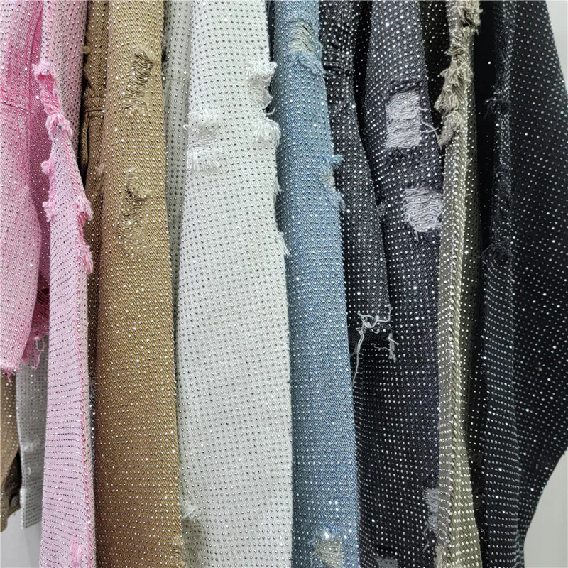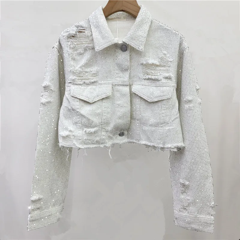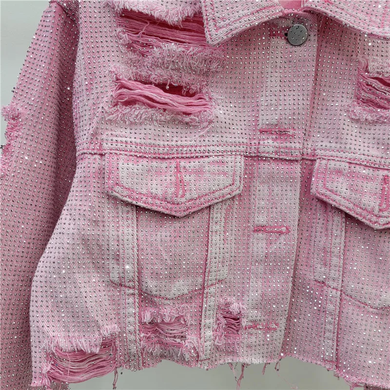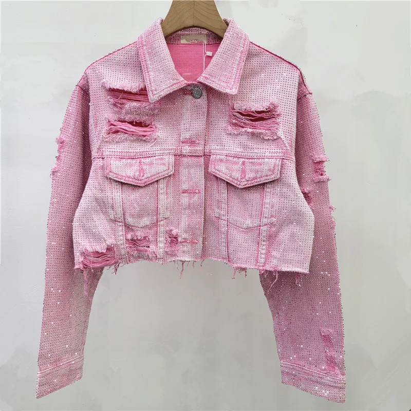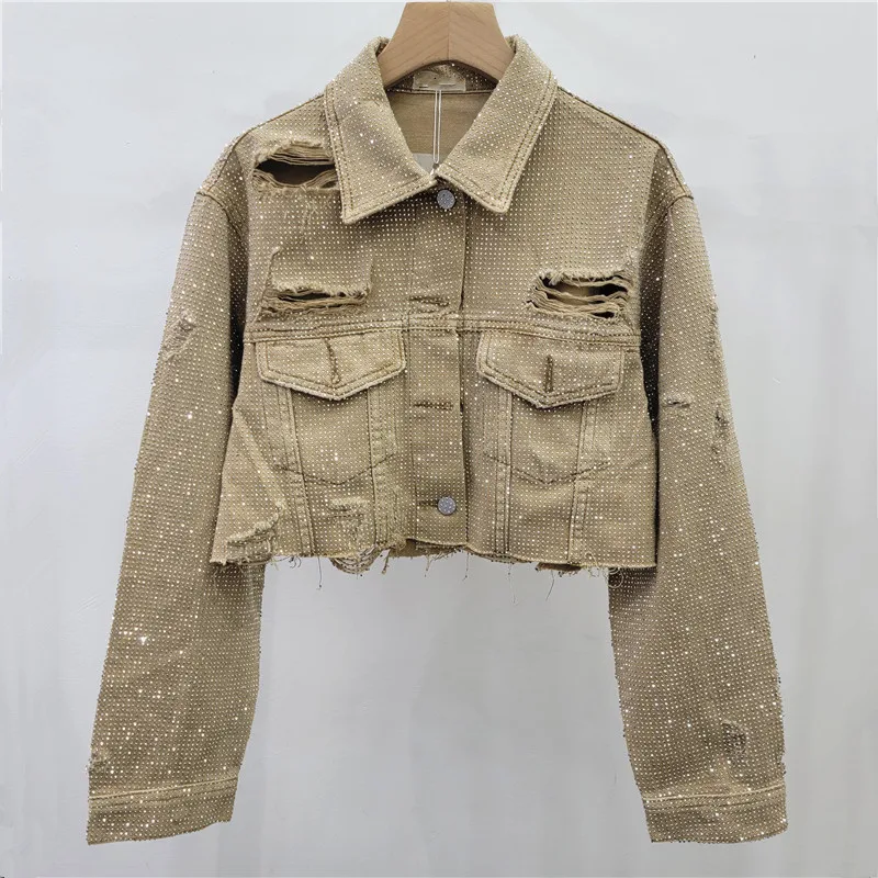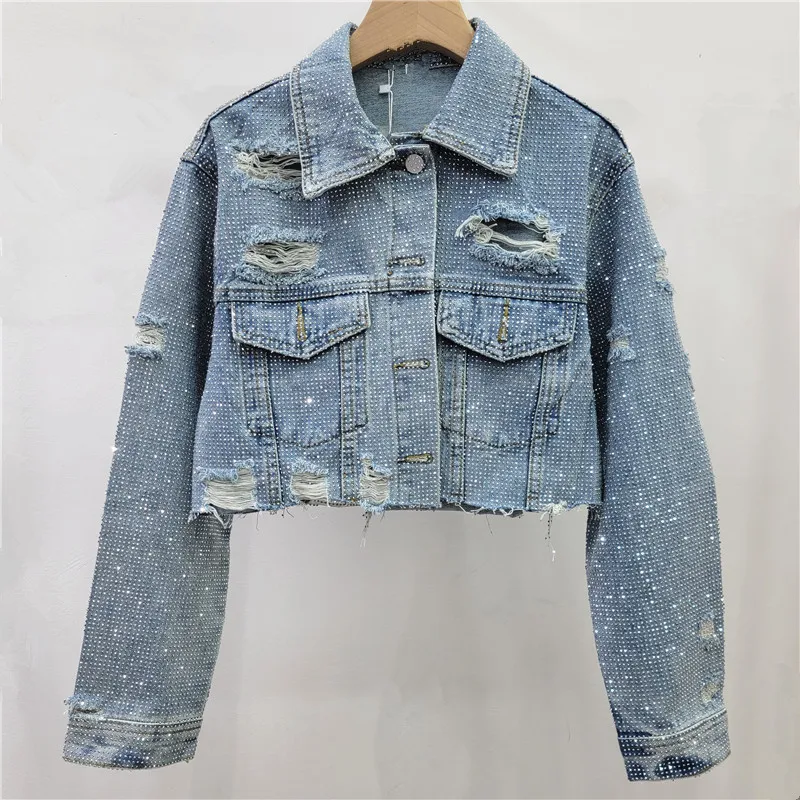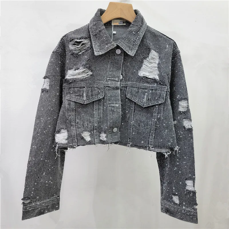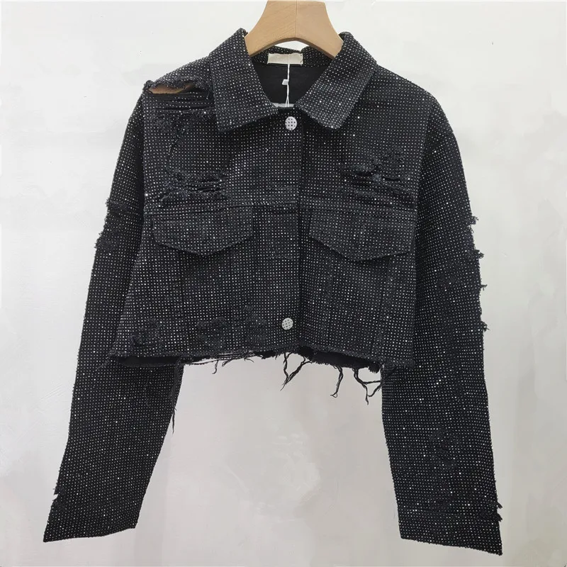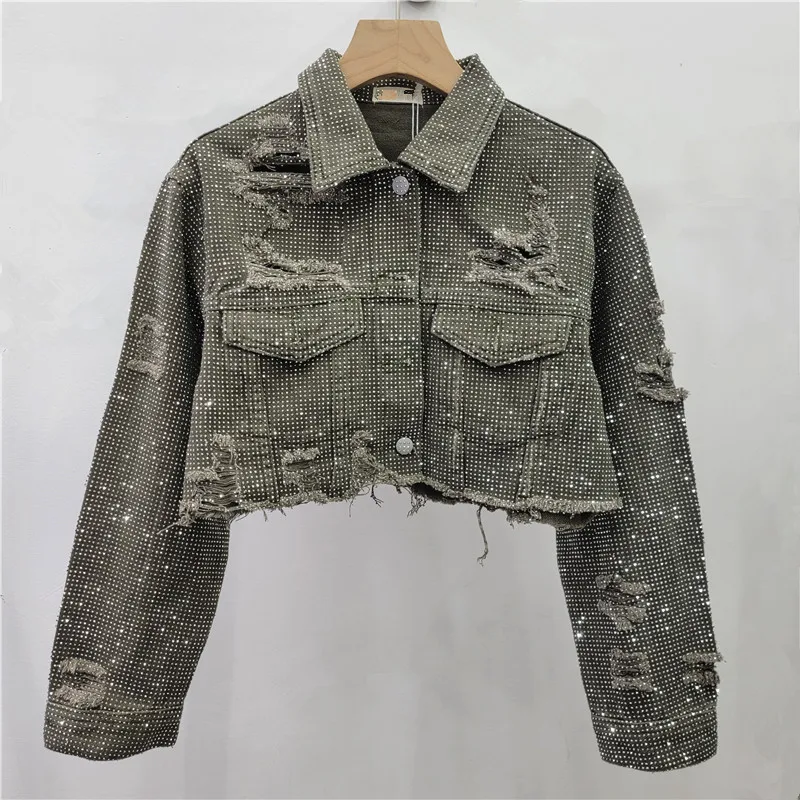 Spring New Fashion Streetwear Distressed Full Diamond Quick Dry Loose Short Denim Jacket Women's Western Sweet Cool Top