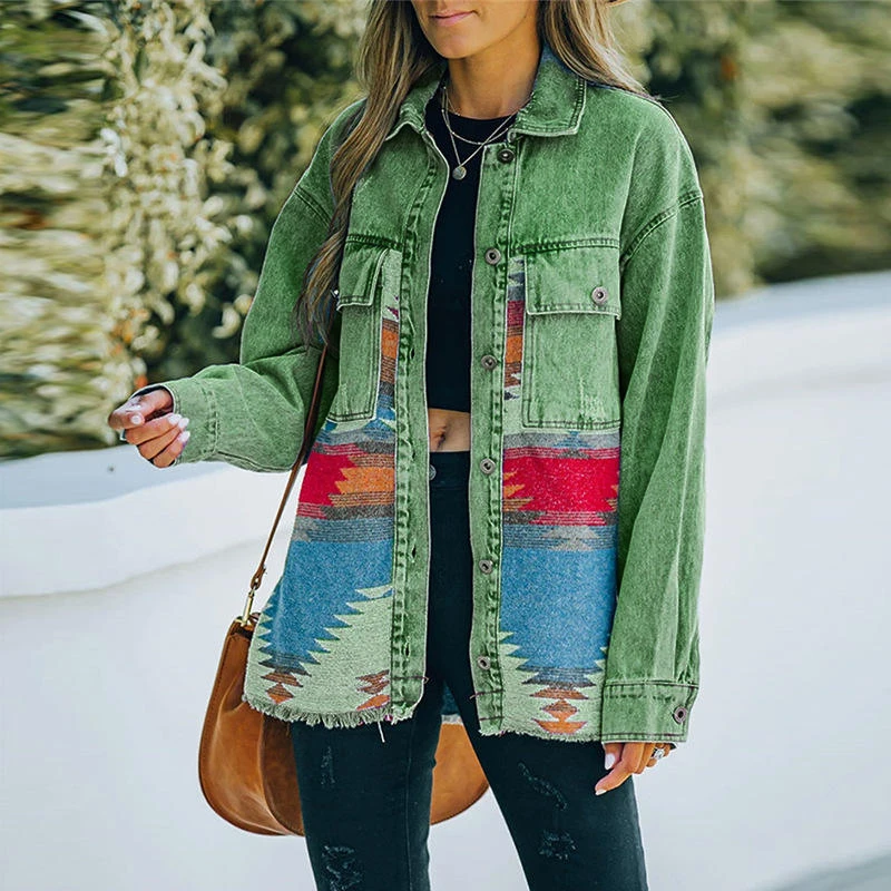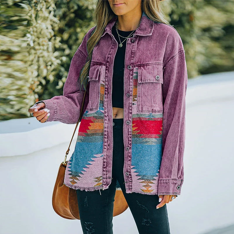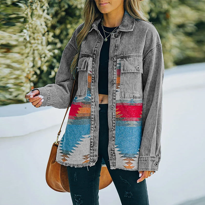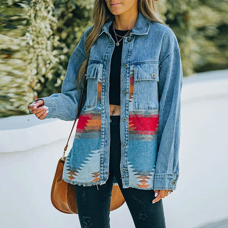 Western Custom Long Sleeve Loose Shacket Boho Outerwear Vintage Denim Aztec Jacket for Women