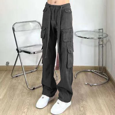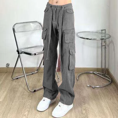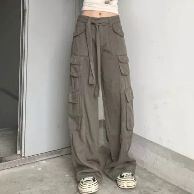 Women Cargo Pants Women's Trousers High Waist Loose Casual Trousers Vintage Lady Multi Pocket Streetwear Straight Wide Leg Jeans