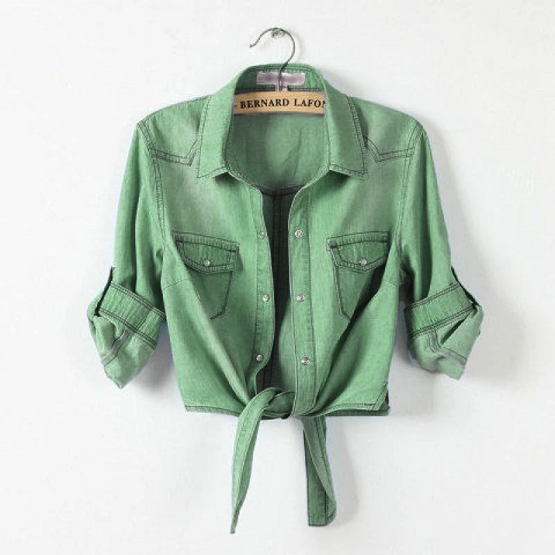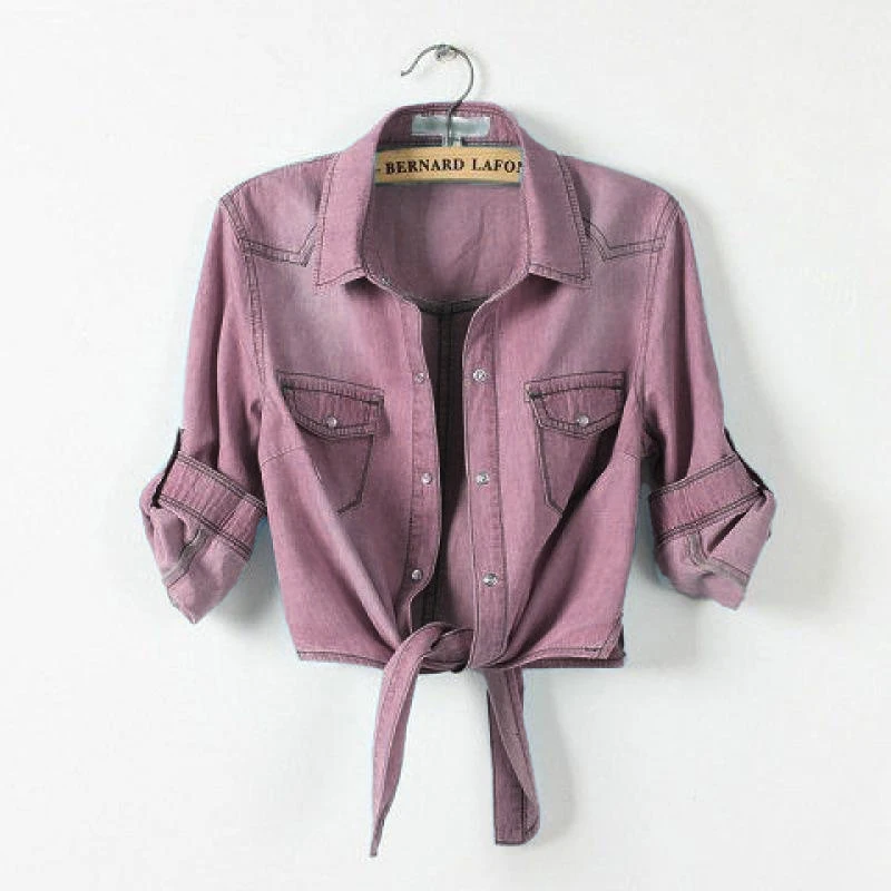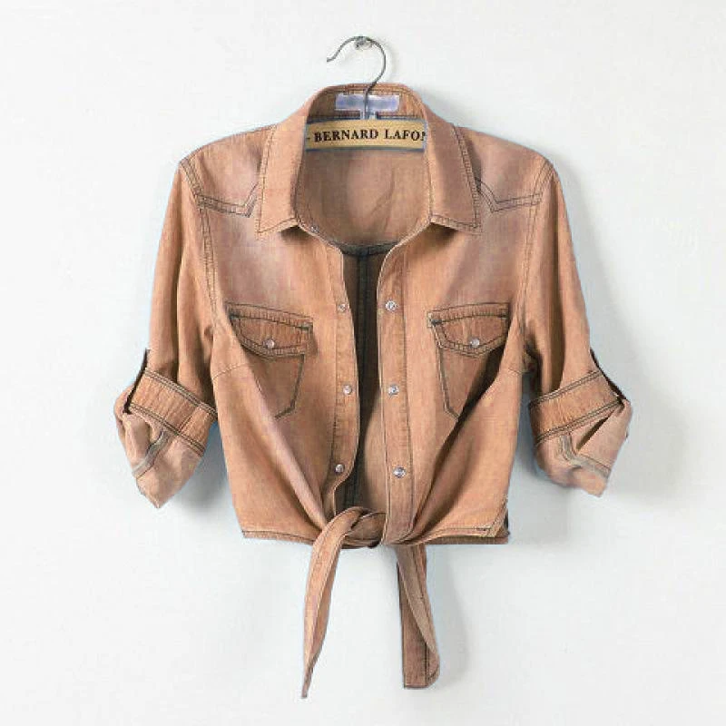 Women's Button-Down Front Shirt With Cuff Sleeves Rolled Up Denim Shirt