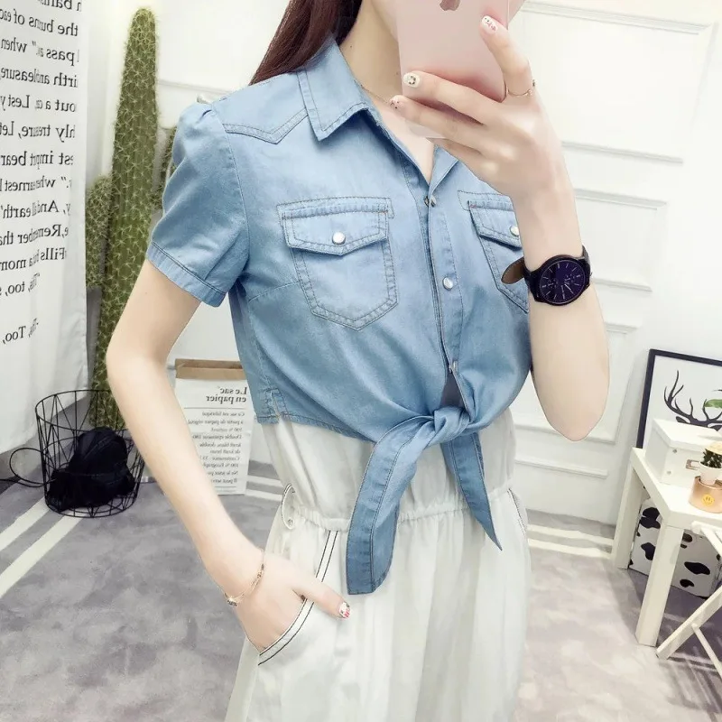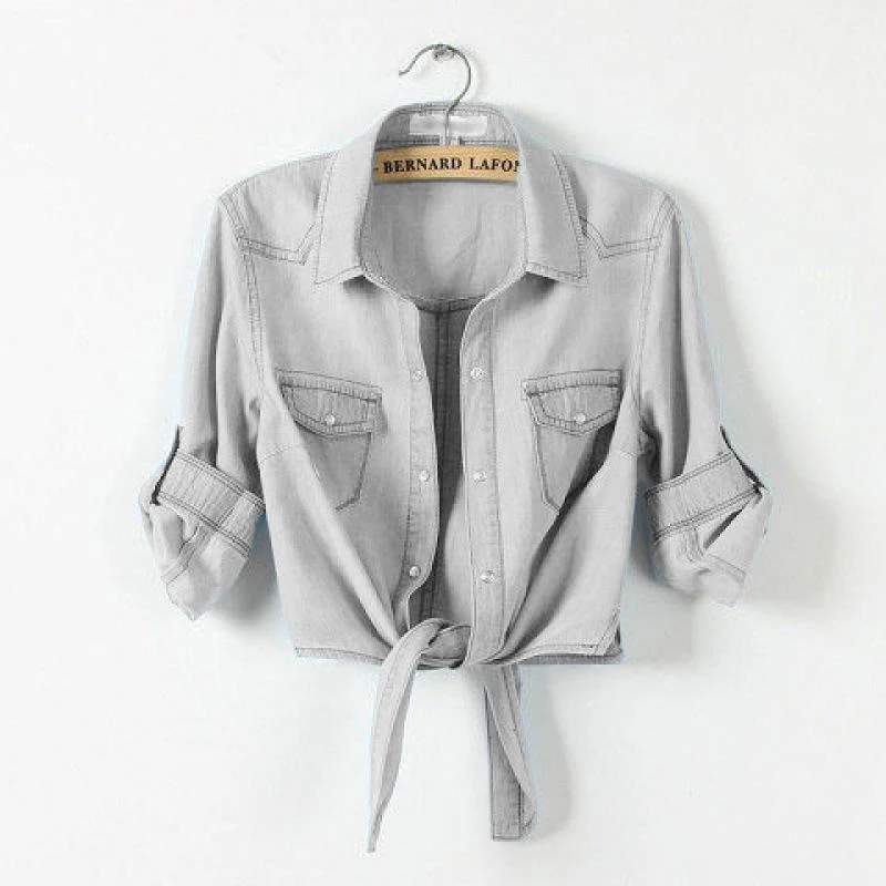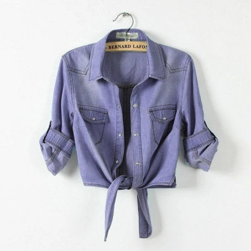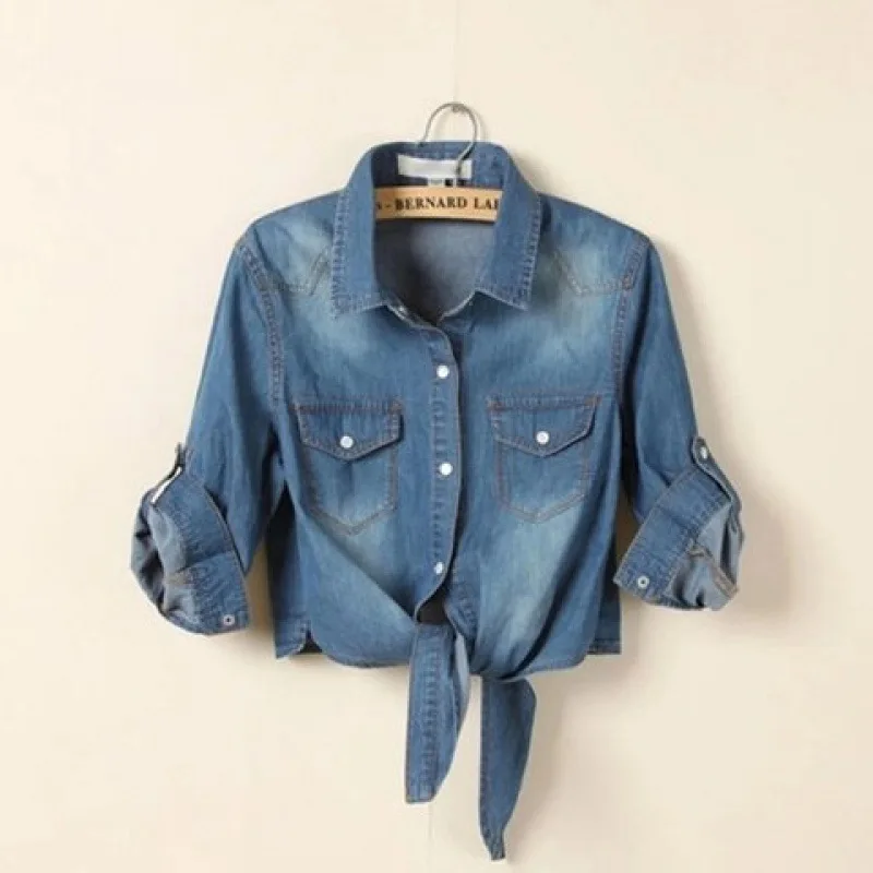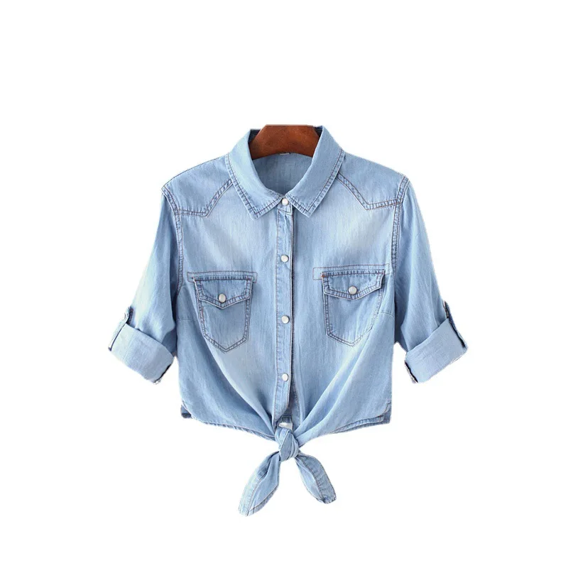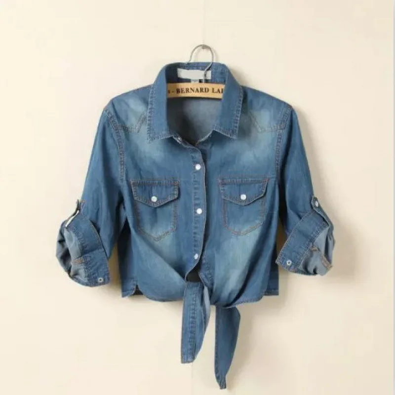 Women's Button-Down Front Shirt With Cuff Sleeves Rolled up Denim Shirt