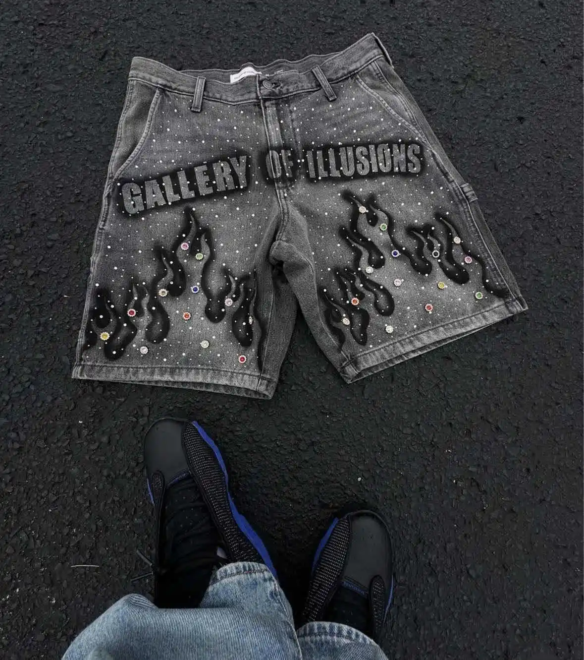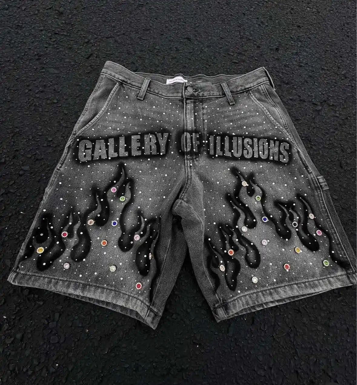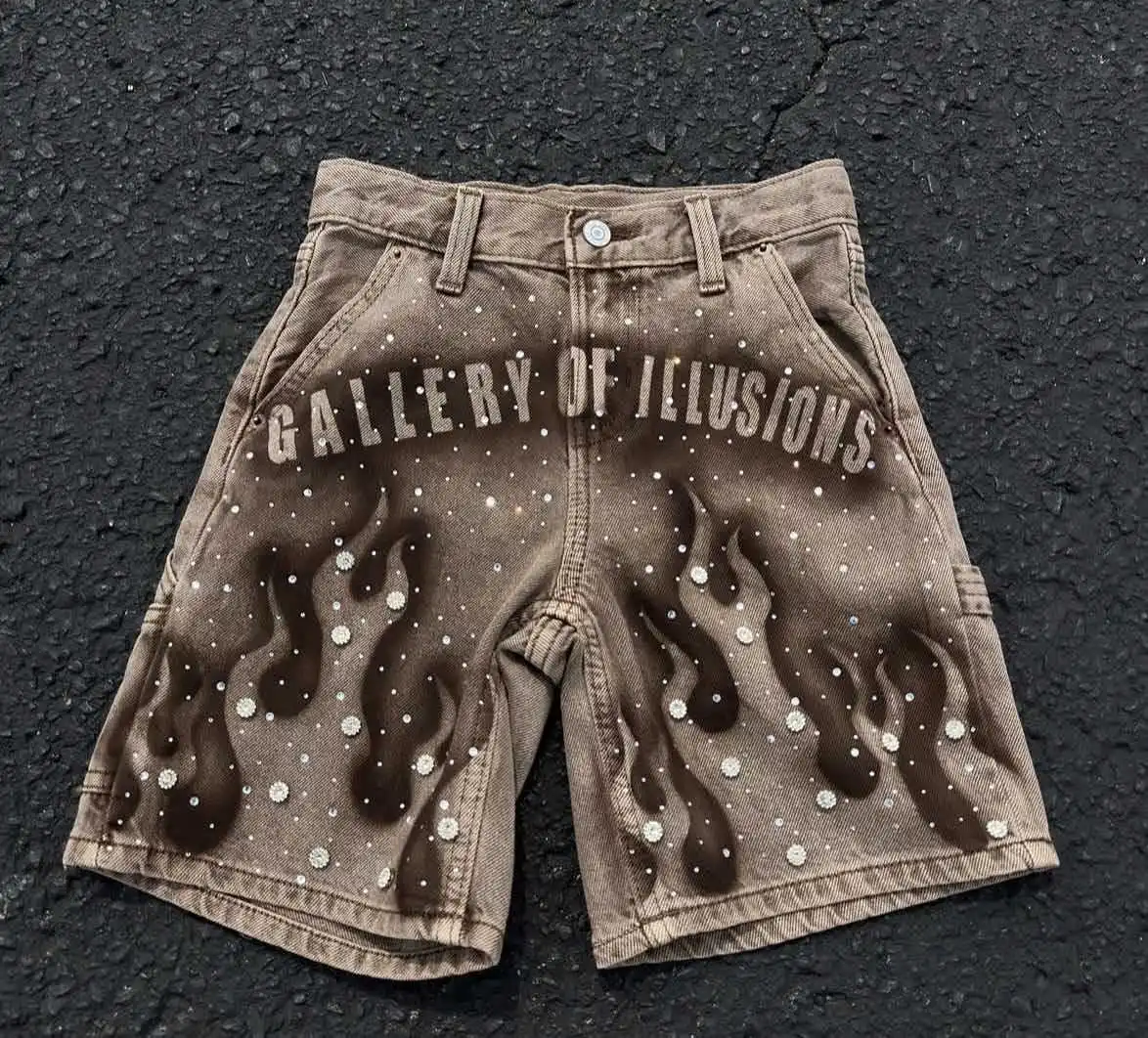 Y2K Summer High-street Fashion Men's Mid Cropped Boot Cut Denim Shorts Hand-painted Prints Rhinestone